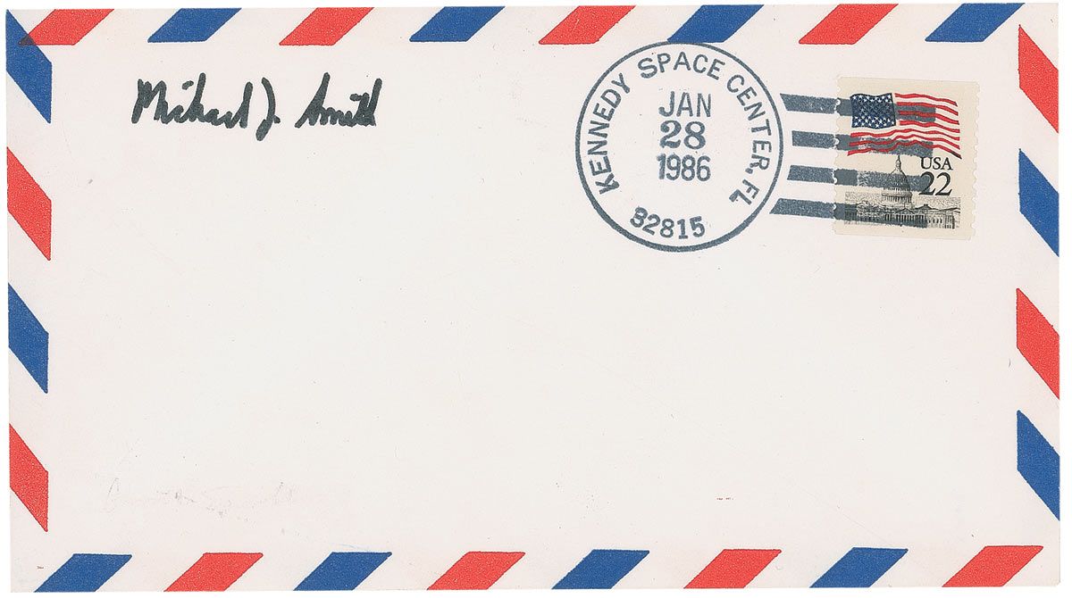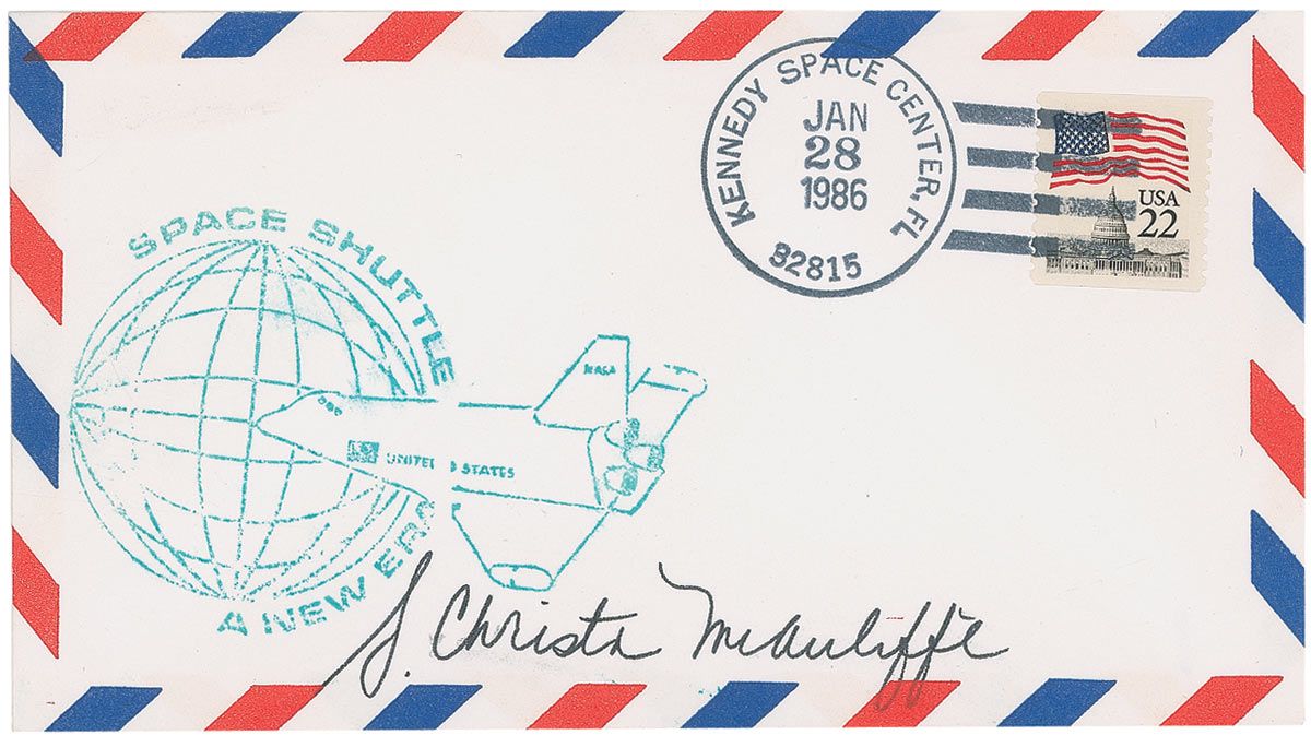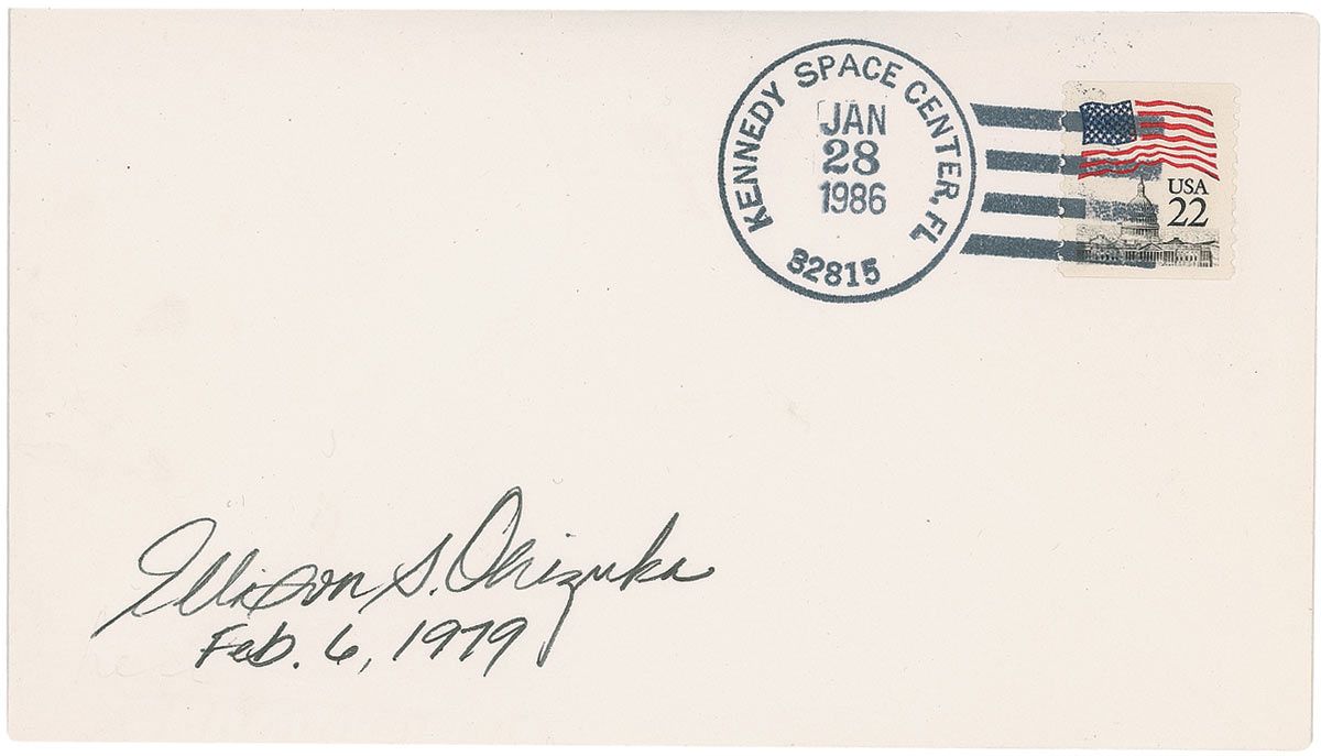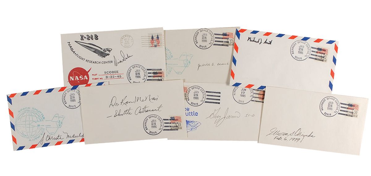 Complete set of seven Challenger postal covers, each postmarked January 28, 1986, and each signed in black ink by an individual Challenger astronaut. Signers are: Greg Jarvis, adding “51-D,”; S. Christa McAuliffe; Ronald McNair, adding “Shuttle Astronaut”; Ellison Onizuka, adding “Feb. 6, 1979”; Judith A. Resnik; Michael J. Smith; and Dick Scobee. In fine condition. An exceptional offering, preserving the crew members’ last moments before embarking on the tragic mission.