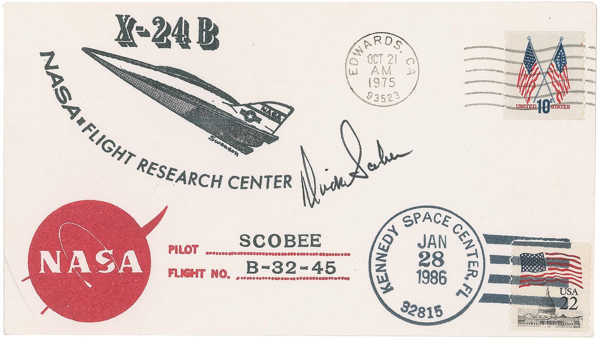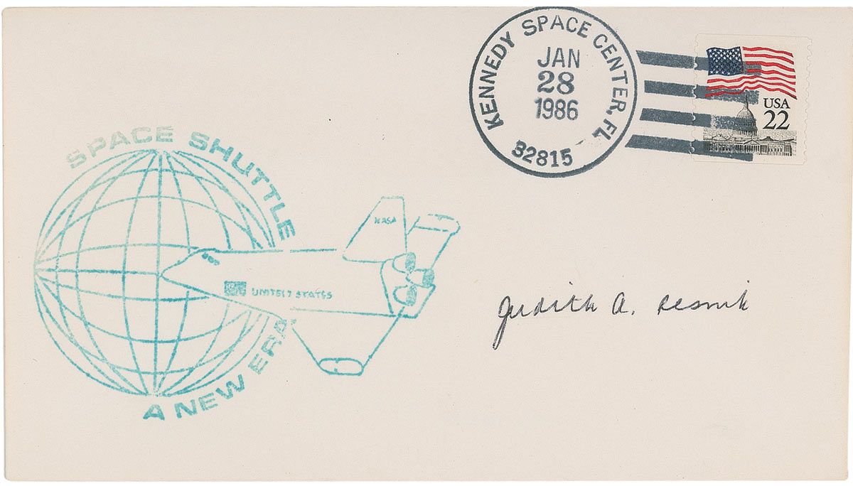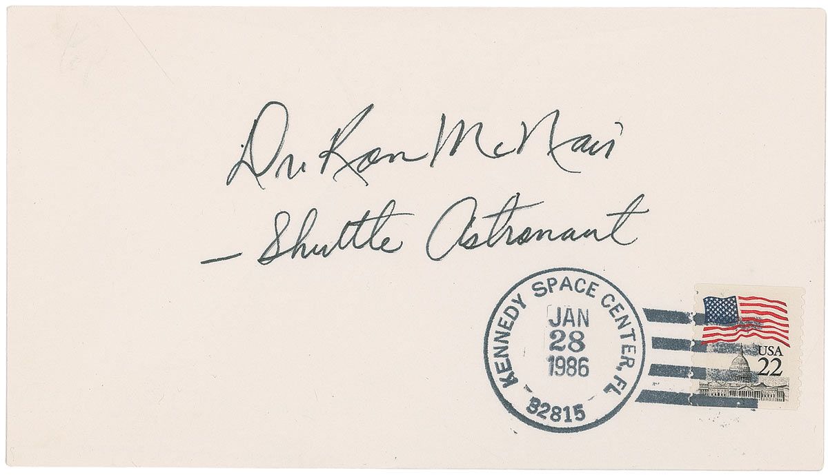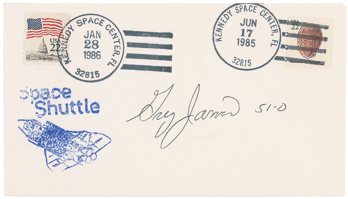 Complete set of seven Challenger postal covers, each postmarked January 28, 1986, and each signed in black ink by an individual Challenger astronaut. Signers are: Greg Jarvis, adding “51-D,”; S. Christa McAuliffe; Ronald McNair, adding “Shuttle Astronaut”; Ellison Onizuka, adding “Feb. 6, 1979”; Judith A. Resnik; Michael J. Smith; and Dick Scobee. In fine condition. An exceptional offering, preserving the crew members’ last moments before embarking on the tragic mission.