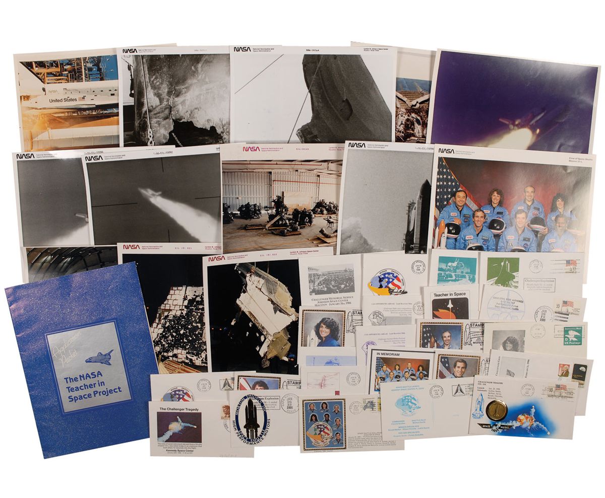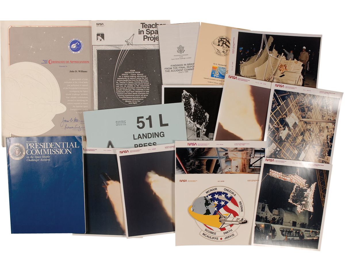 Collection of 38 items, almost all relating to the Challenger disaster. Items include: a blank Teacher in Space application packet; a Teacher in Space NASA fact sheet; 32 commemorative covers honoring the crew and mission; a program from the January 31, 1986, memorial; a copy of the Presidential Commission on the Space Shuttle Challenger Accident; a NASA landing parking pass; and a certificate of appreciation issued to John D. Williams in support of the accident investigation. In overall fine condition.