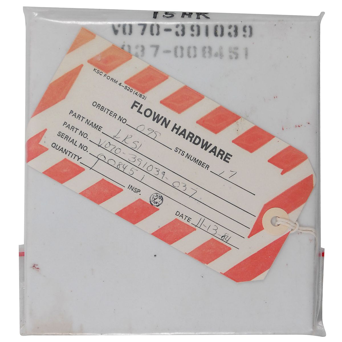 Available to US bidders only. Very rare Challenger-flown LRSI (Low-temperature Reusable Surface Insulation) tile, 6 x 6.5, #V070-391039 037-008451. Tile was flown on the first six flights of Challenger: STS-6 (maiden voyage), STS-7, 8, 41-B, 41-C, and 41-G, before being replaced. Accompanied by its Flown Hardware tag, filled in by a technician, “Orbiter No. 099, STS Number 17,” (referring to its 17th processing flow), dated November 13, 1984. These tiles would cover the upper wing near the leading edge. They are also used in selected areas of the forward, mid, and aft fuselage, vertical tail, and the OMS/RCS pods. These tiles protect areas where reentry temperatures are below 1,200 °F. The white color is by design and helps to manage heat in orbit when the orbiter is exposed to direct sunlight. These tiles are reusable for up to 100 missions with refurbishment (100 missions is also the design lifetime of each orbiter). White tiles rarely become available for sale.