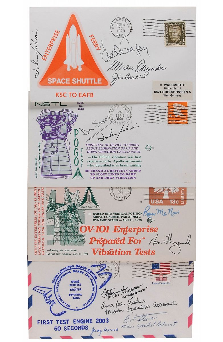 Four commemorative covers bearing cachets honoring various Space Shuttle events, each signed by one of the astronauts on the ill-fated Challenger mission, along with members of other crews. Challenger signers are Ellison Onizuka, Judy Resnik, Ron McNair, and Dick Scobee. In overall fine condition.