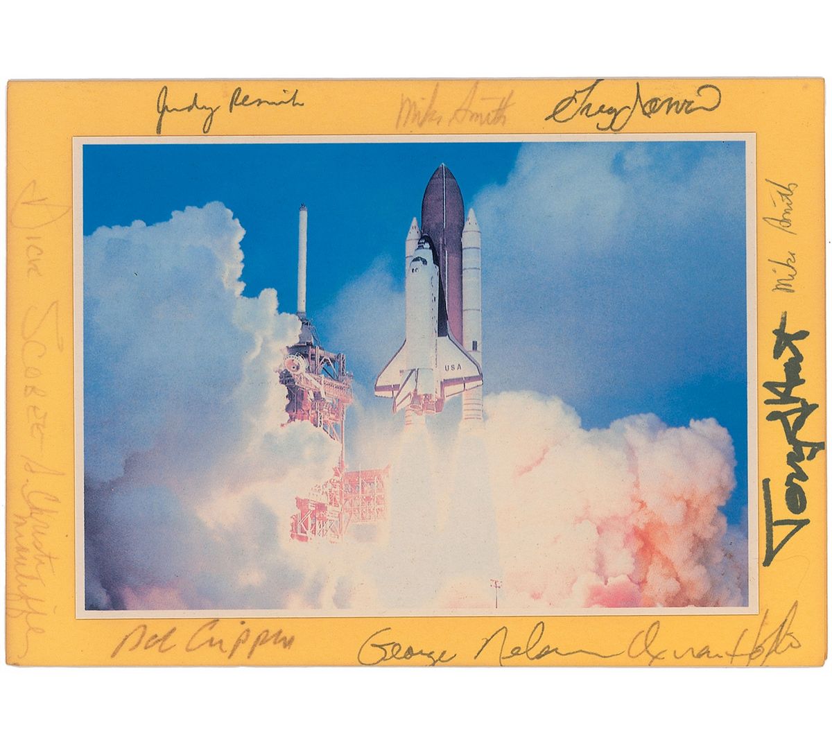 Color glossy 5.75 x 4 laser print photo of a shuttle launch affixed to a 7 x 5 mount, signed on the edges of the mount in felt tip and ballpoint by crew members S. Christa McAuliffe, Dick Scobee, Judy Resnik, and Mike Smith (2). Mount is also signed by STS-41-C crew members Bob Crippen, George Nelson, Terry Hart, and ‘Ox’ van Hoften. Several signatures fairly light, but still completely legible, otherwise fine condition.