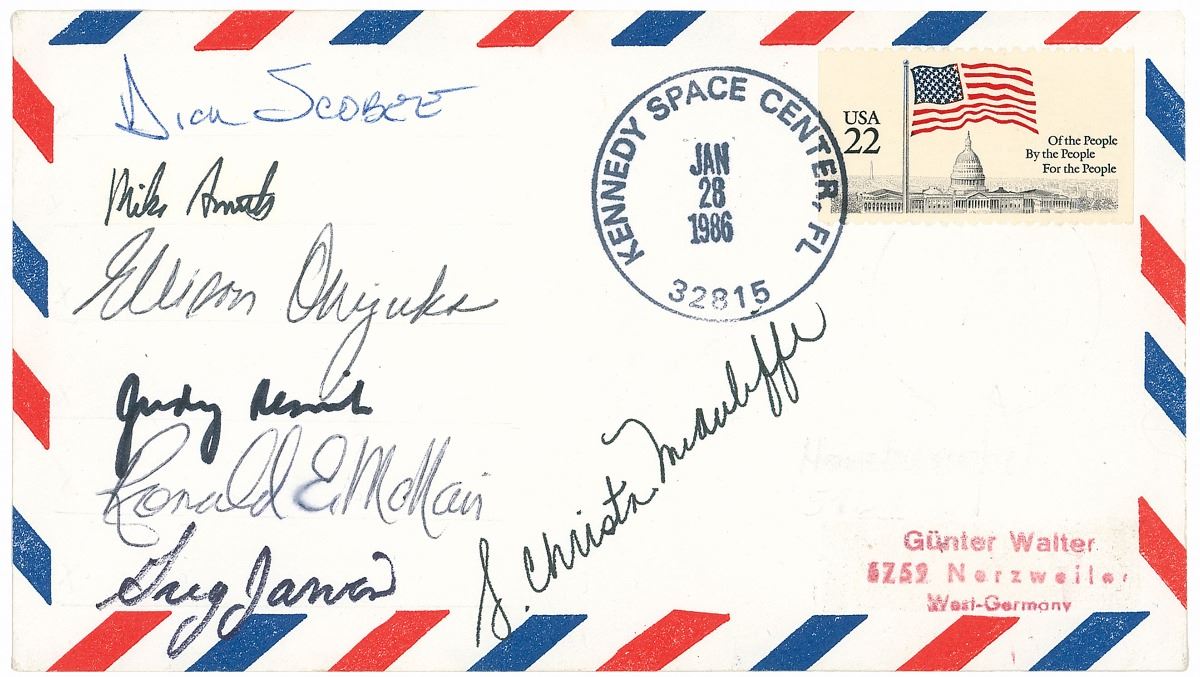 Extremely rare postal cover with a Kennedy Space Center launch day postmark from the day of the Challenger disaster, January 28, 1986, signed in various inks by Dick Scobee, Mike Smith, Ellison Onizuka, Judy Resnik, Ronald E. McNair, Greg Jarvis, and S. Christa McAuliffe. In fine condition, with a water spot to McNair’s middle initial. A rare gathering from this sobering space tragedy.