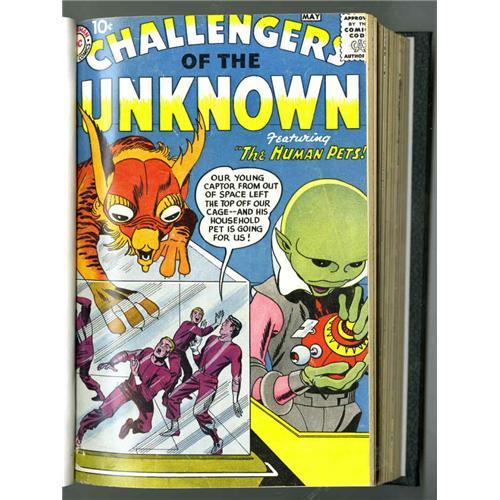 <B>Challengers of the Unknown #1-15 Bound Volume (DC, 1958-60).</B></I> Among Jack Kirby's first work for DC comics in the '50s was this eponymous series, considered to be Kirby's most notable output of that period, as well as a precursor to the <B>Fantastic Four</B></I>. This volume collects copies of he first 15 issues of the series, which also features art by Bob Brown in the later issues, hardbound with the title and issue numbers embossed on the spine. The covers are in fairly good condition, with most having several creases, a few minor tears, and/or small stains. The page quality is great, with little to staining and only a light amount of tanning. All issues have been trimmed as part of the binding process. Overstreet 2005 VG 4.0 value for group = $1,398.