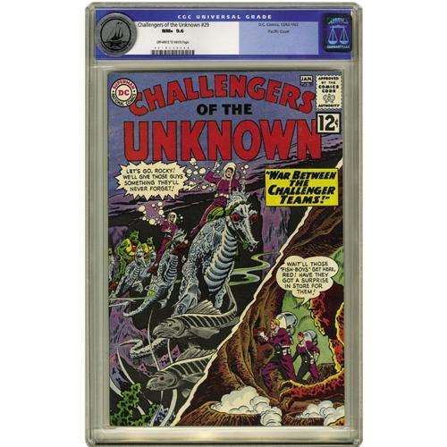 <B>Challengers of the Unknown #29 Pacific Coast pedigree (DC, 1963) CGC NM+ 9.6 Off-white to white pages.</B></I> It's Challengers vs. Challengers, with evil aliens behind it all! This pedigree copy is the only 9.6, and highest-graded copy overall, that CGC has certified for this issue to date. Overstreet 2006 NM- 9.2 value = $105. CGC census 3/06: 1 in 9.6, none higher.