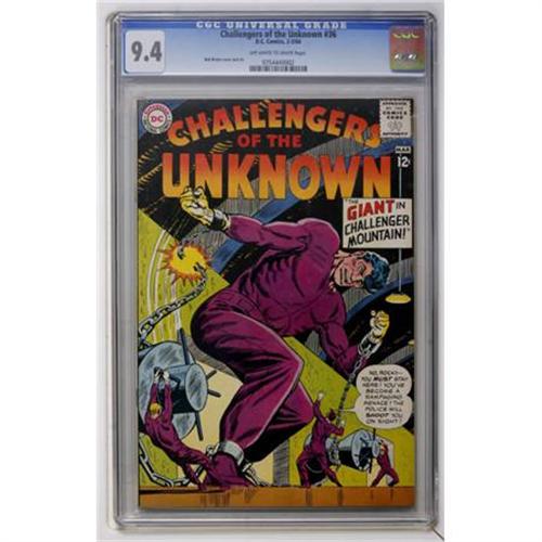 <B>Challengers of the Unknown #36 (DC, 1964) CGC NM 9.4 Off-white to white pages.</B></I> Bob Brown cover and art. Overstreet 2007 NM- 9.2 value = $75. CGC census 6/07: 2 in 9.4, none higher. <I>From the Keith Marlow Collection.</B></I><BR><BR><b>Shipping:</b> Comics - Slabbed (certified) (<a target="_blank" href="http://www.heritageauctions.com/common/shipping.php">view shipping information</a>)