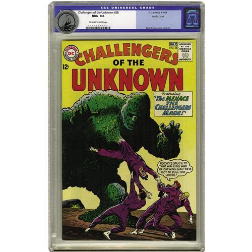 <B>Challengers of the Unknown #38 Pacific Coast pedigree (DC, 1964) CGC NM+ 9.6 Off-white to white pages.</B></I> The Challengers take on the Ooze, in an issue drawn by Bob Brown. Overstreet 2006 NM- 9.2 value = $65. CGC census 3/06: 1 in 9.6, none higher.