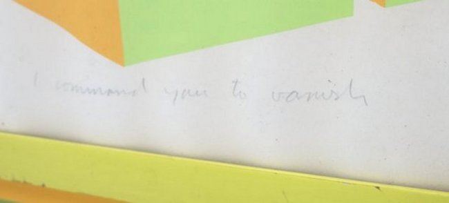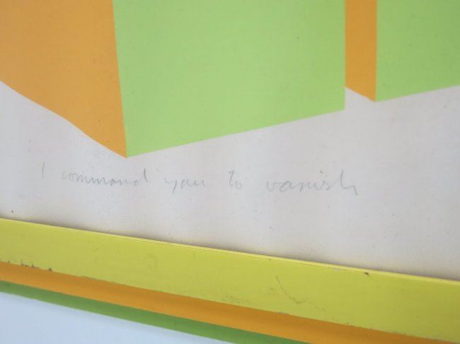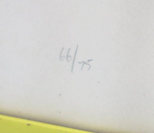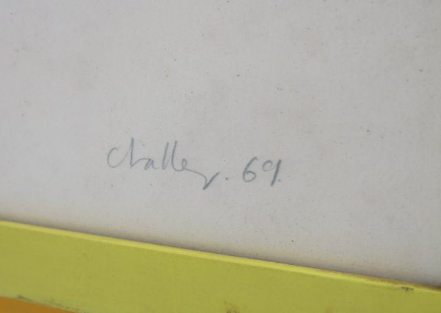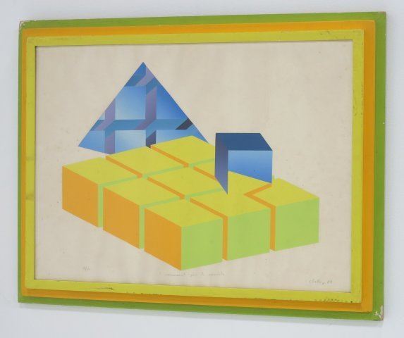 Geometric abstract. Silkscreen. Framed. Pencil signed Challey, numbered 66/75. Approx. 22" x 30" without frame, 28" x 36" with frame. (3506) Slight foxing.