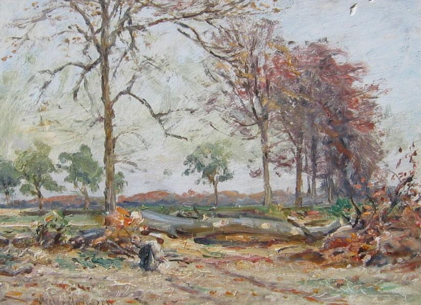 HECTOR CHALMERS (British 1849 - 1943 ) Cut timber near Cramma Oil on board 10.5" x 14.5" (26.67 x 36.83cm.) Signed lower left; titled on label verso
