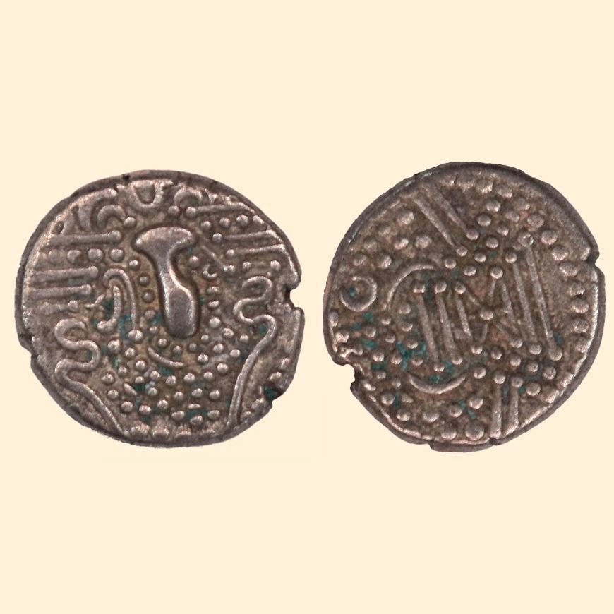 4.10gms, OBV: Stylized crowned bust of ruler facing to right, REV: Fire altar. (Deyell #