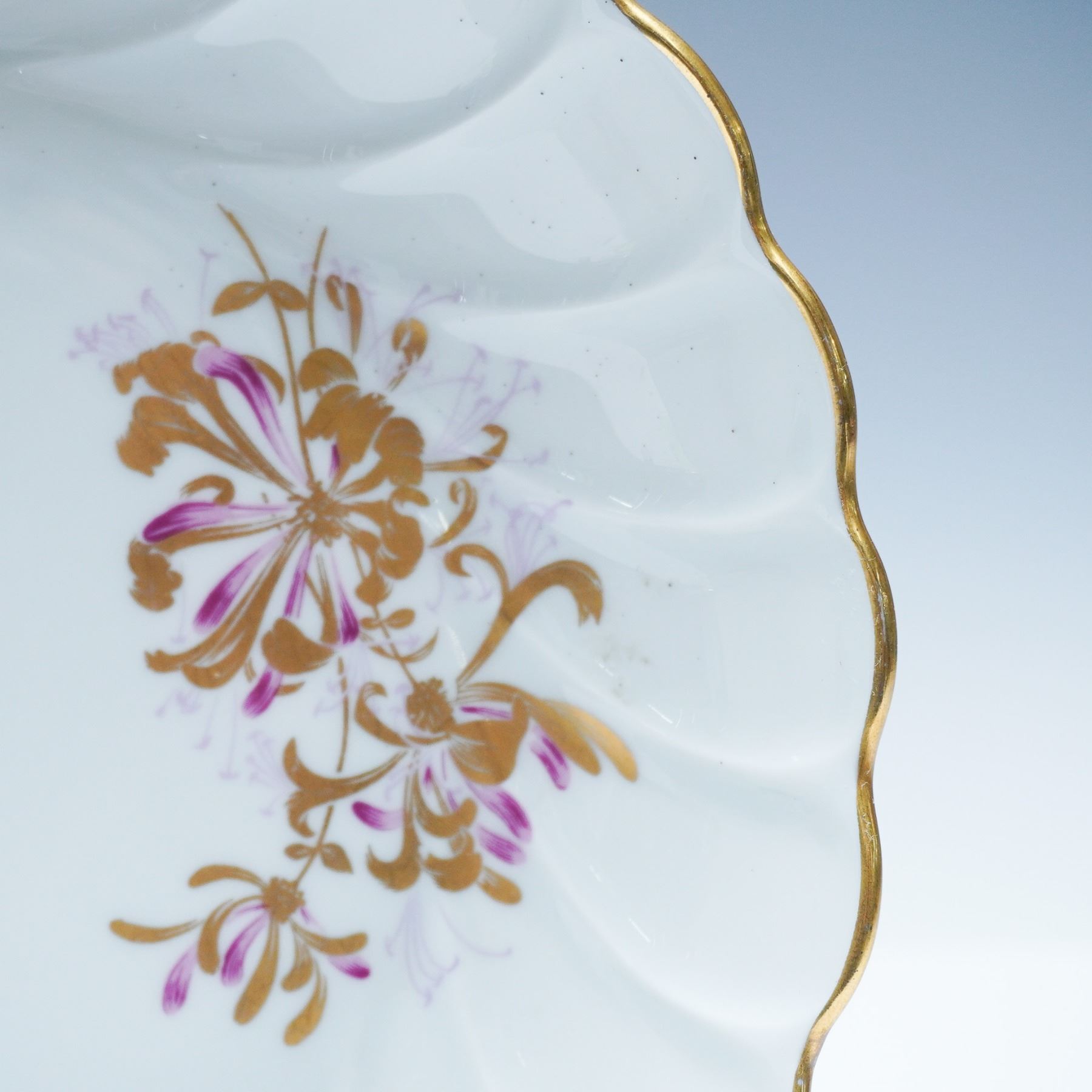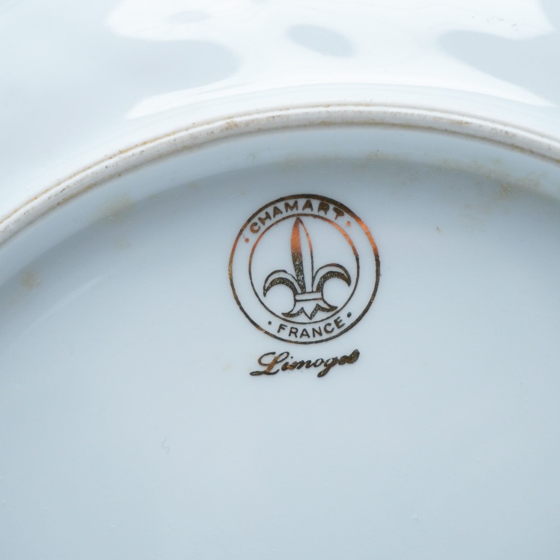 Exquisite Chamart Limoges porcelain bowl, featuring an elegant floral motif in hand-painted gold and delicate purple accents. The scalloped edge is adorned with a rich gilt trim, enhancing the refined craftsmanship of this fine French porcelain piece. Marked "Chamart France" and "Limoges", signifying its distinguished heritage in the renowned Limoges porcelain tradition. This beautifully detailed bowl exudes timeless sophistication, making it a perfect addition to any fine china collection or elegant table setting.