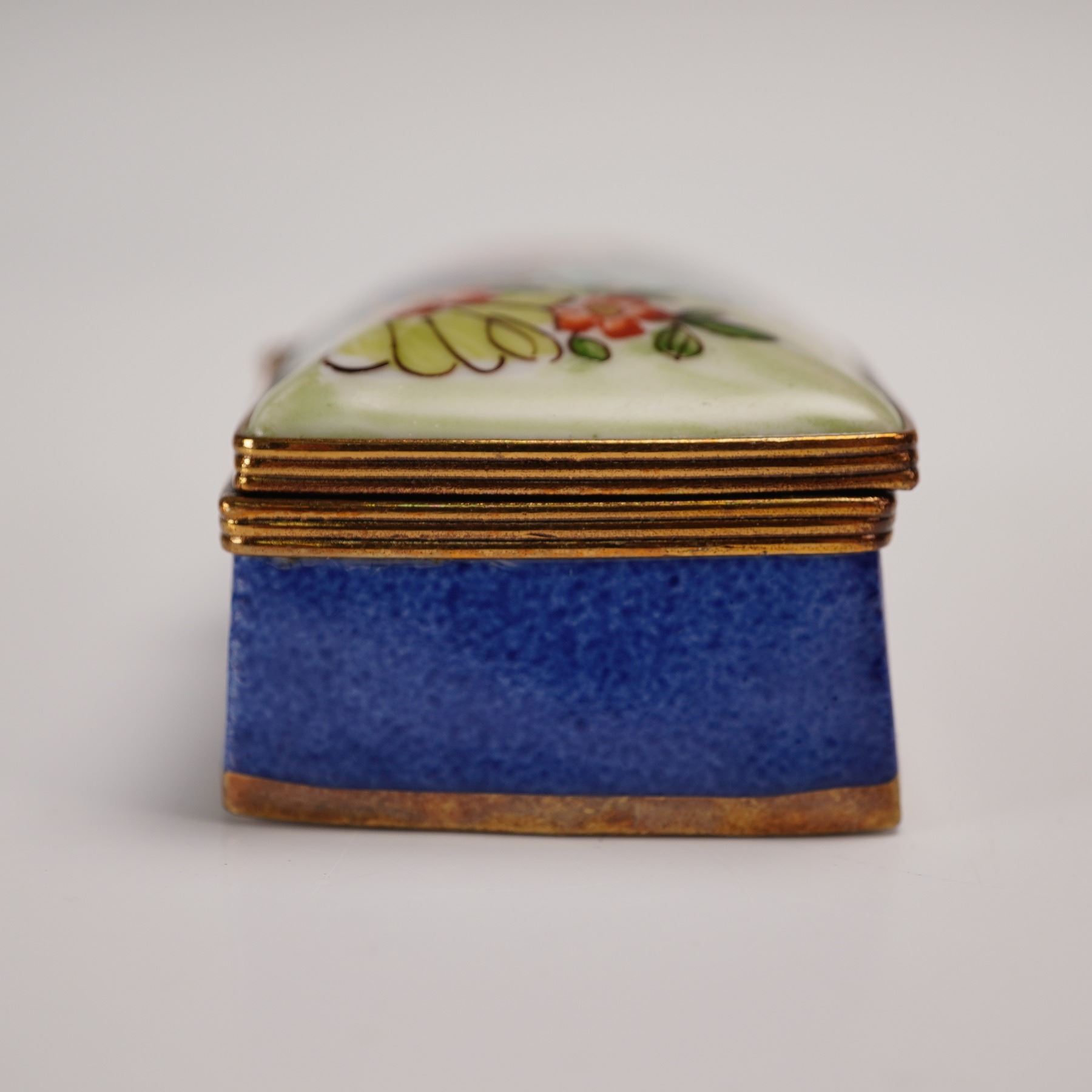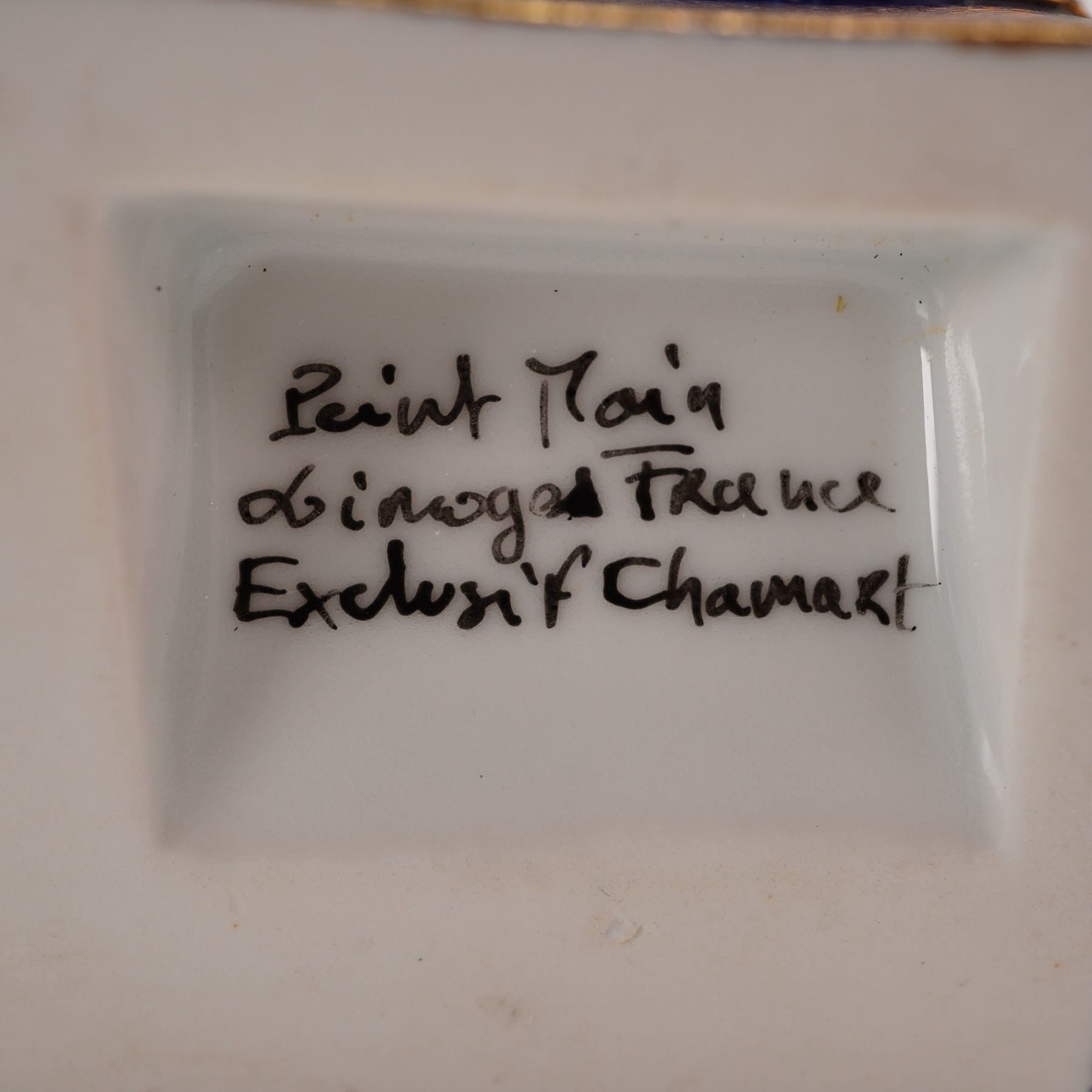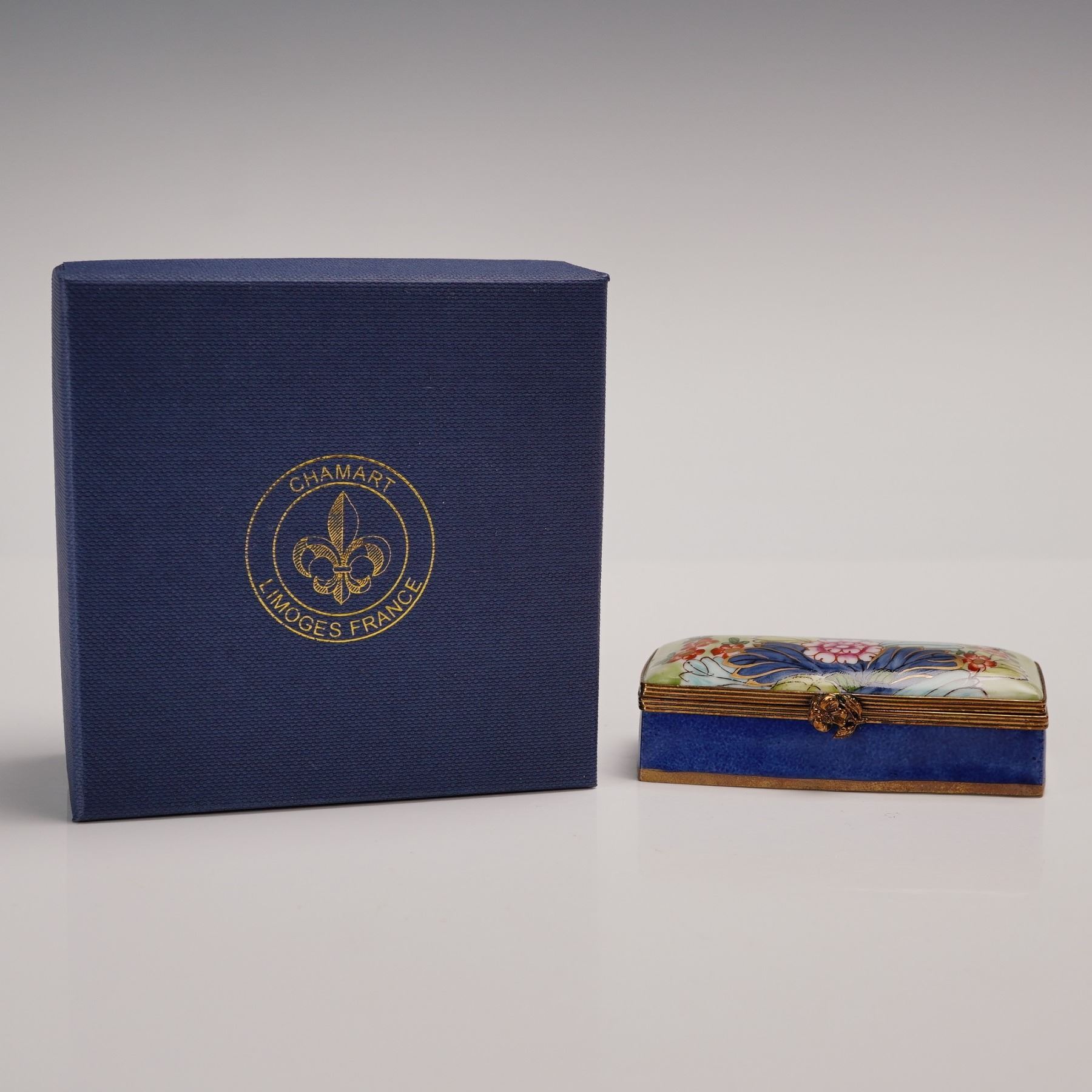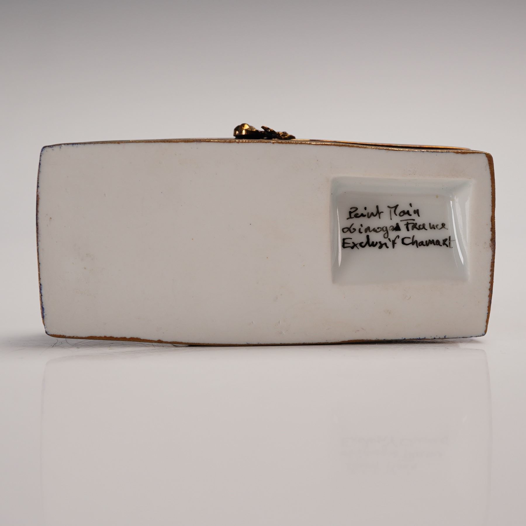 Hand painted Chamart Limoges France porcelain hinged treasure box in the form of a sleeping child resting on a pillow, wearing a floral shirt and blue cap. The clasp opens to reveal a painted parasol motif inside. Marked Chamart Peint a la main Limoges France to the base. Complete with original Chamart Limoges France navy blue presentation box. Measures 2"H. Box measures 4.5"L x 2"H.