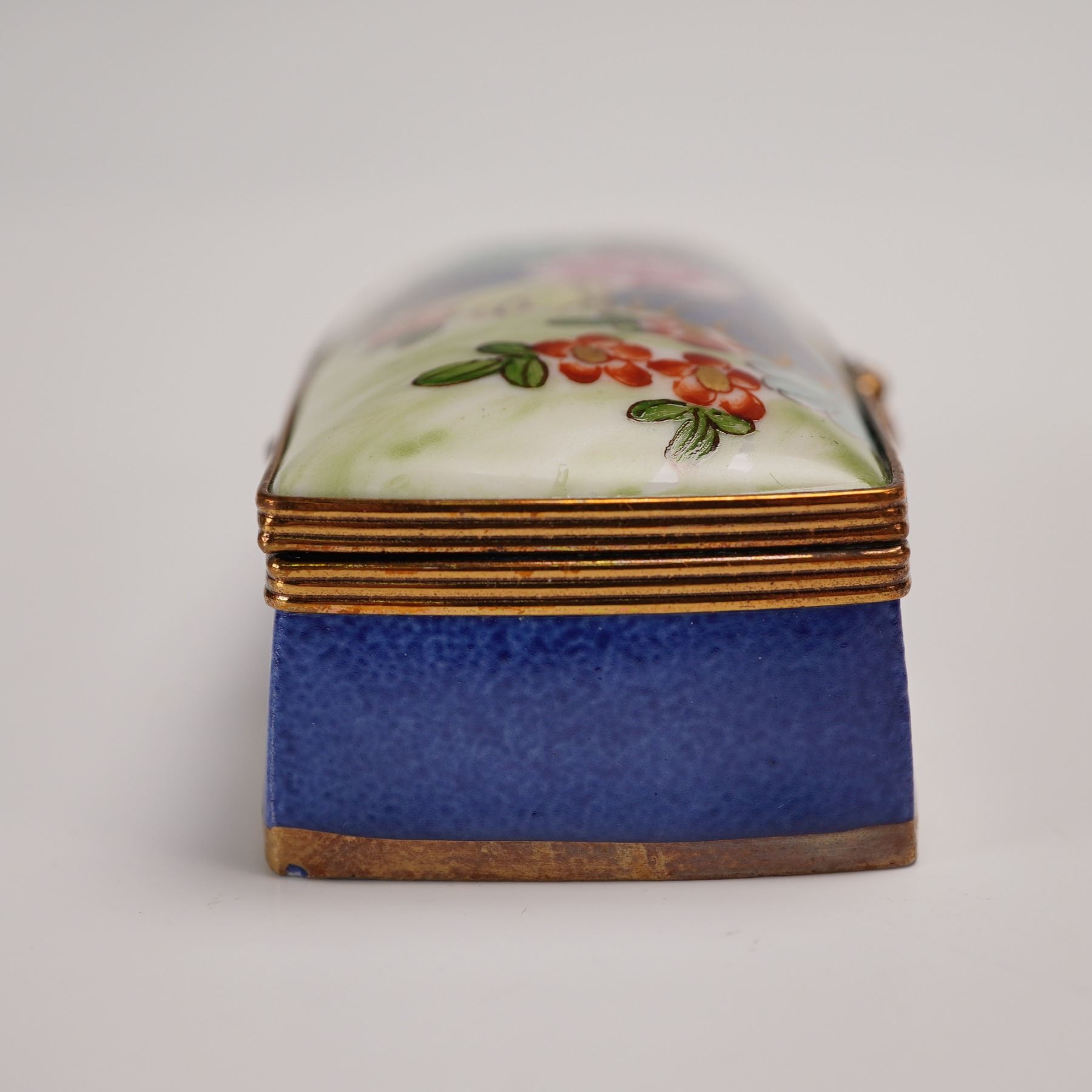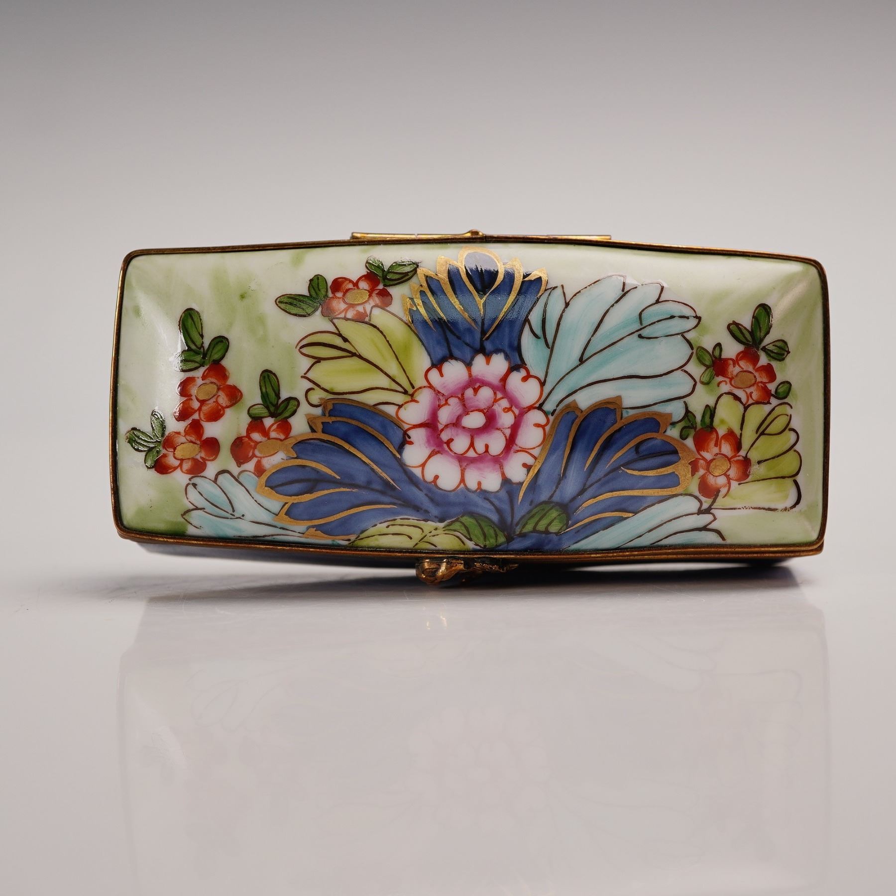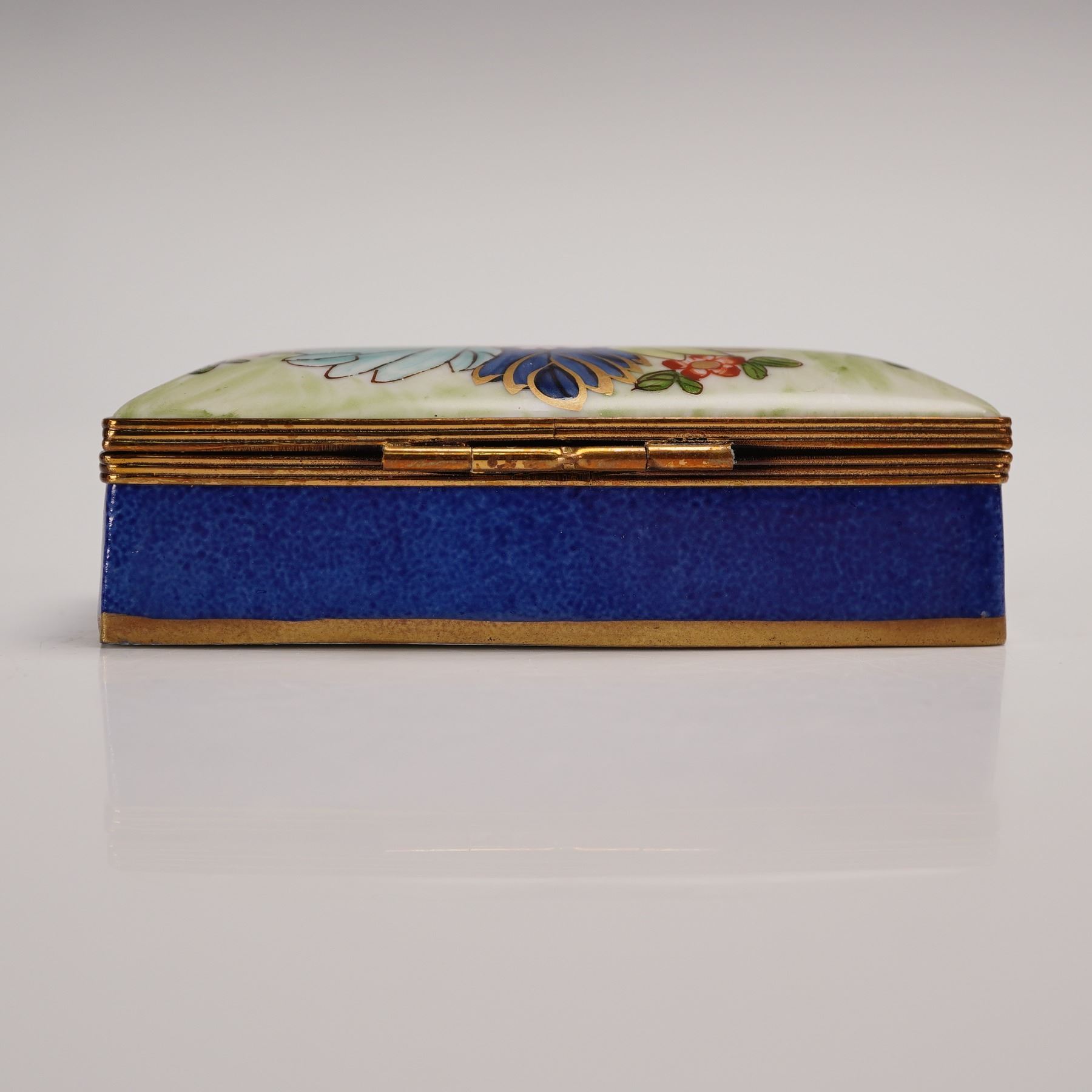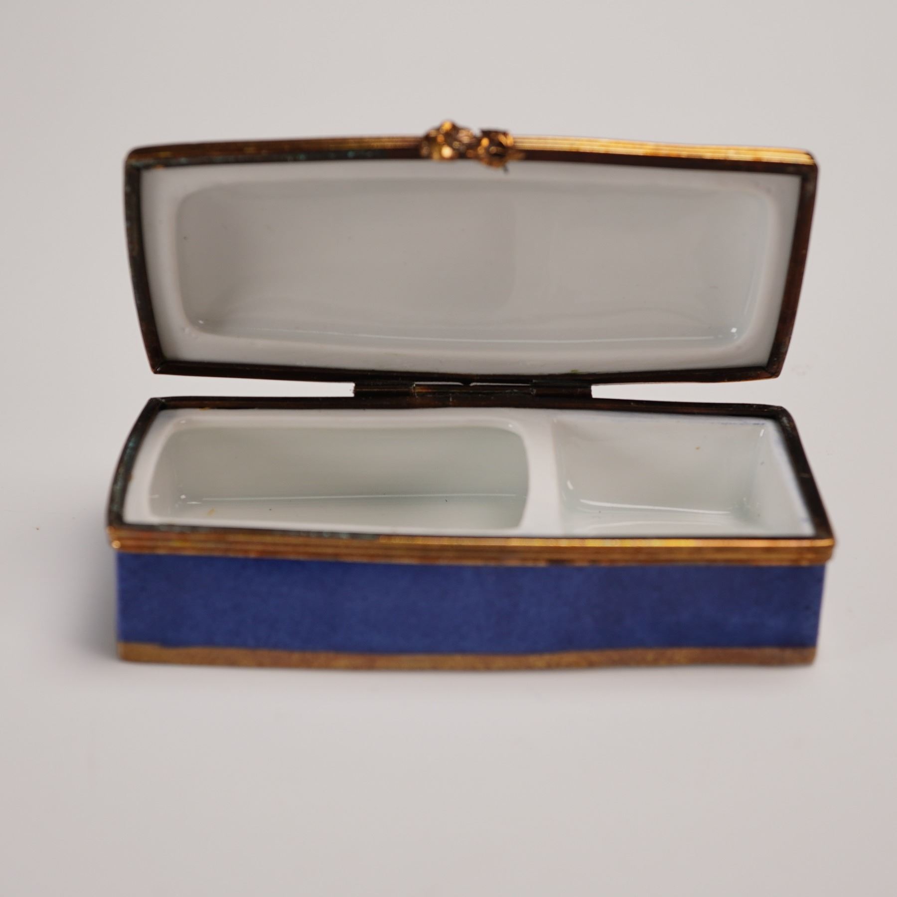Hand painted Chamart Limoges France porcelain hinged treasure box in the form of a sleeping child resting on a pillow, wearing a floral shirt and blue cap. The clasp opens to reveal a painted parasol motif inside. Marked Chamart Peint a la main Limoges France to the base. Complete with original Chamart Limoges France navy blue presentation box. Measures 2"H. Box measures 4.5"L x 2"H.