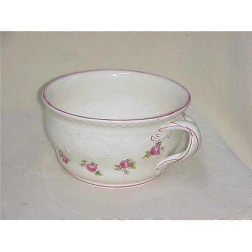 A Minton chamber pot, 9" diameter and 5" tall, with a pretty interlaced handle. Hand painted over tranfer decoration. Raised floral swags circle the bowl. The interior of the bowl has lost it's glaze but the exterior in very nice, beautiful to hold a pot of flowers. marked as shown. Condition is good no chips or cracks, just a bit dull on the interior.