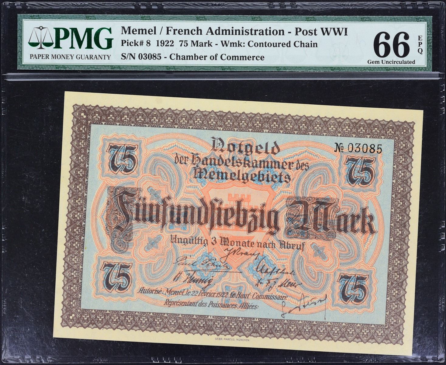5 pieces in lot. A Gem group of these popular Memel notes with the following; P-1 in Gem Uncirculated 66 EPQ; P-3b, 4b, 5b in Gem Uncirculated 65 EPQ; P-8 in Gem Uncirculated 66 EPQ.