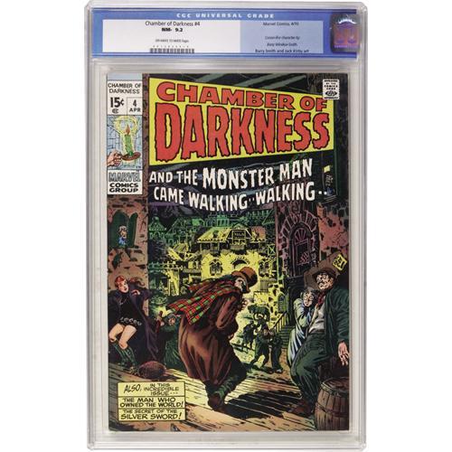 <B>Chamber of Darkness #4 (Marvel, 1970) CGC NM- 9.2 Off-white to white pages.</B></I> Featuring the Conan-like character Starr the Slayer, with a story by Roy Thomas and art by Barry Smith. Also includes stories penciled by Jack Kirby and Tom Sutton. Cover by Marie Severin. Overstreet 2006 NM- 9.2 value = $95. CGC census 3/07: 7 in 9.2, 21 higher.<BR><BR><b>Shipping:</b> Comics - Slabbed (certified) (<a target="_blank" href="http://www.heritageauctions.com/common/shipping.php">view shipping information</a>)