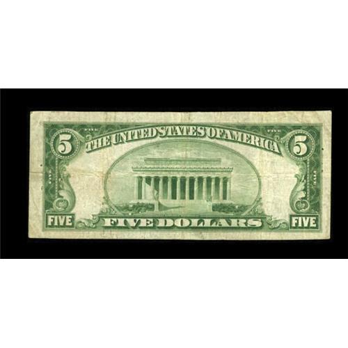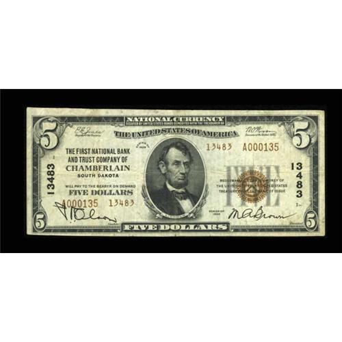 <B>Chamberlain, SD</B></I> - $5 1929 Ty. 2 <B>The First NB & TC</B></I> Ch. # 13483<BR> Do not think that the census figure of twenty pieces known from this bank indicates its real availability, as twelve of that number can be found in two uncut number one sheets. Singles are actually quite scarce, with the last offering coming on a 2002 fixed price list. Pleasing <B>Fine-Very Fine.</B></I><BR><I>From The Kansas City Collection.</B></I><BR><BR><b>Shipping:</b> Coins & Currency (<a target="_blank" href="http://www.heritageauctions.com/common/shipping.php">view shipping information</a>)
