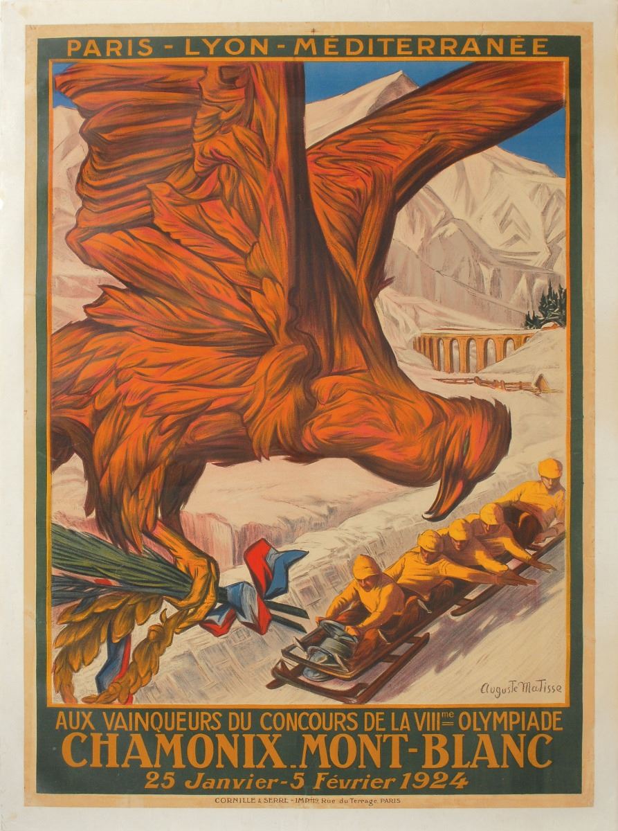 Beautiful color 42 x 31 poster designed by Auguste Matisse for the 1924 Chamonix Winter Olympics, the first ever held. The poster depicts an eagle soaring high above a bobsled track, and provides information about the Olympics in the lower border, “Aux Vainqueurs du concours de la VIII Olympiade, Chamonix Mont-Blanc, 25 Janvier–5 Fevrier 1924.” Printed by Cornille & Serre, Paris. The poster has been professionally restored and linen backed. This was one of three posters produced for the Olympics by the Paris-Lyon-Mediterranee railway company, all of which showed the new athletic facilities that the company helped to finance. This is undoubtedly the most popular of the three variations of Chamonix posters, and just 5,000 were produced.
