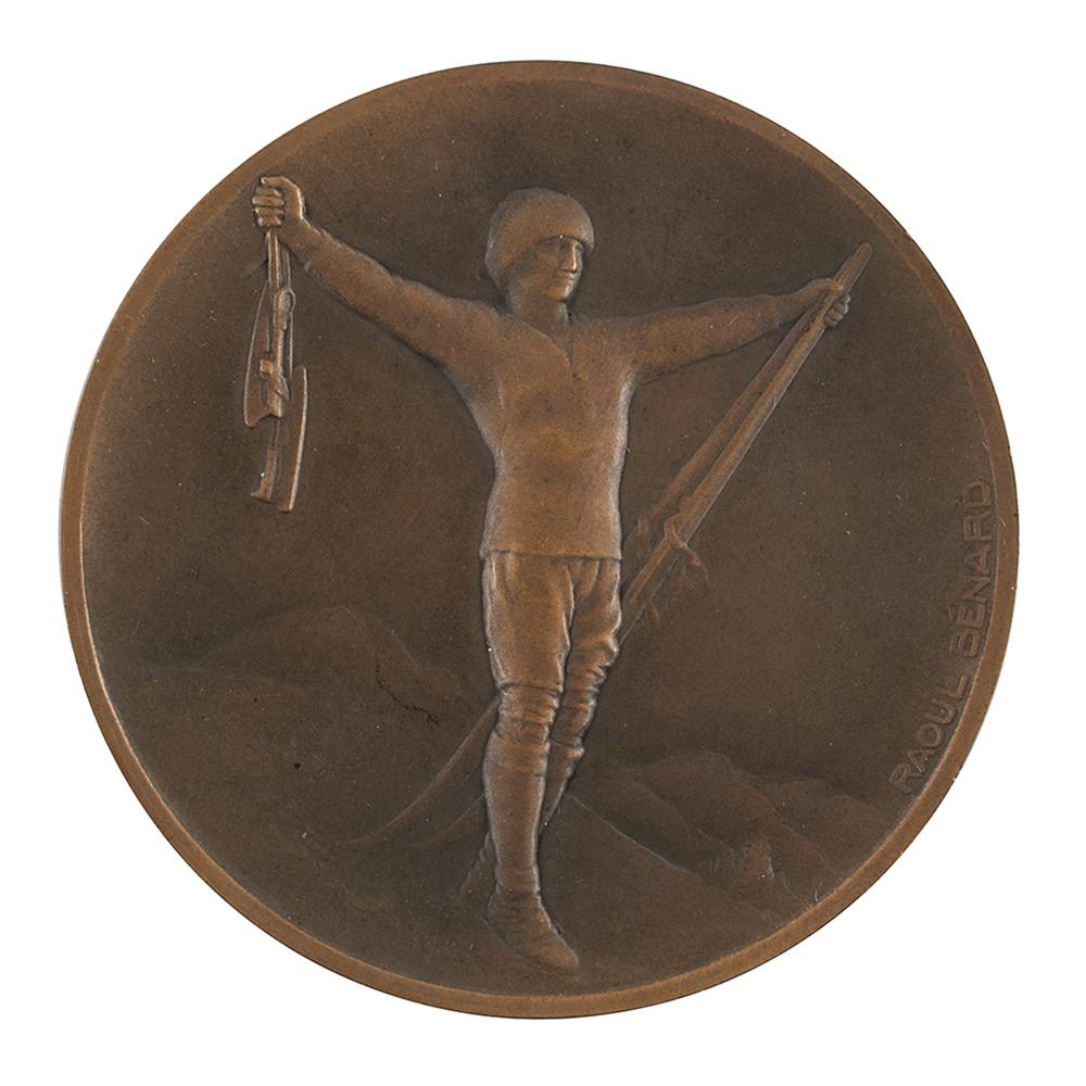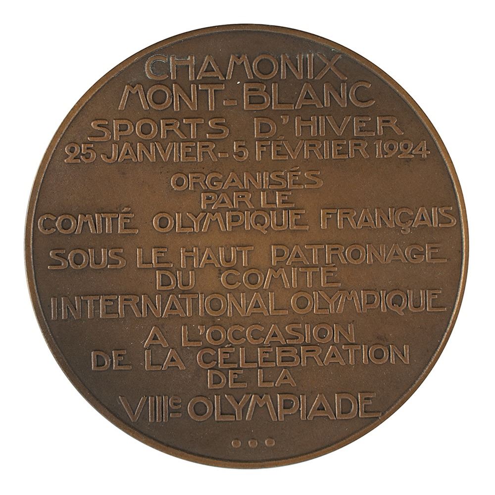 Exceedingly rare medal from the Chamonix 1924 Winter Olympics, which was issued as the bronze medal to third-place winners and also used as the participation medal of the Games. Bronze, 56 mm, 69 gm, by Raoul Benard, Paris. The front features a victorious athlete holding ice skates and skis high in the air with the Alps in the background; the reverse is inscribed at length in French, "Chamonix Mont-Blanc Sports D'Hiver, 25 Janvier-5 Fevrier 1924, Organises par le Comite Olympique Francais sous le haut patronage du Comite International Olympique a l'occasion de la celebration de la VIII Olympiade [Chamonix Mont-Blanc Winter Sports, 25 January-5 February 1924, Organized by the French Olympic Committee under the patronage of the International Olympic Committee on the occasion of the celebration of the VIII Olympiad]." The edge is stamped "Bronze."
