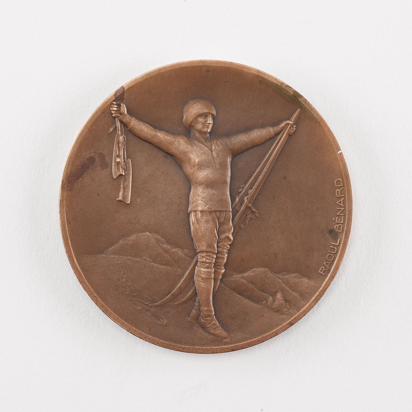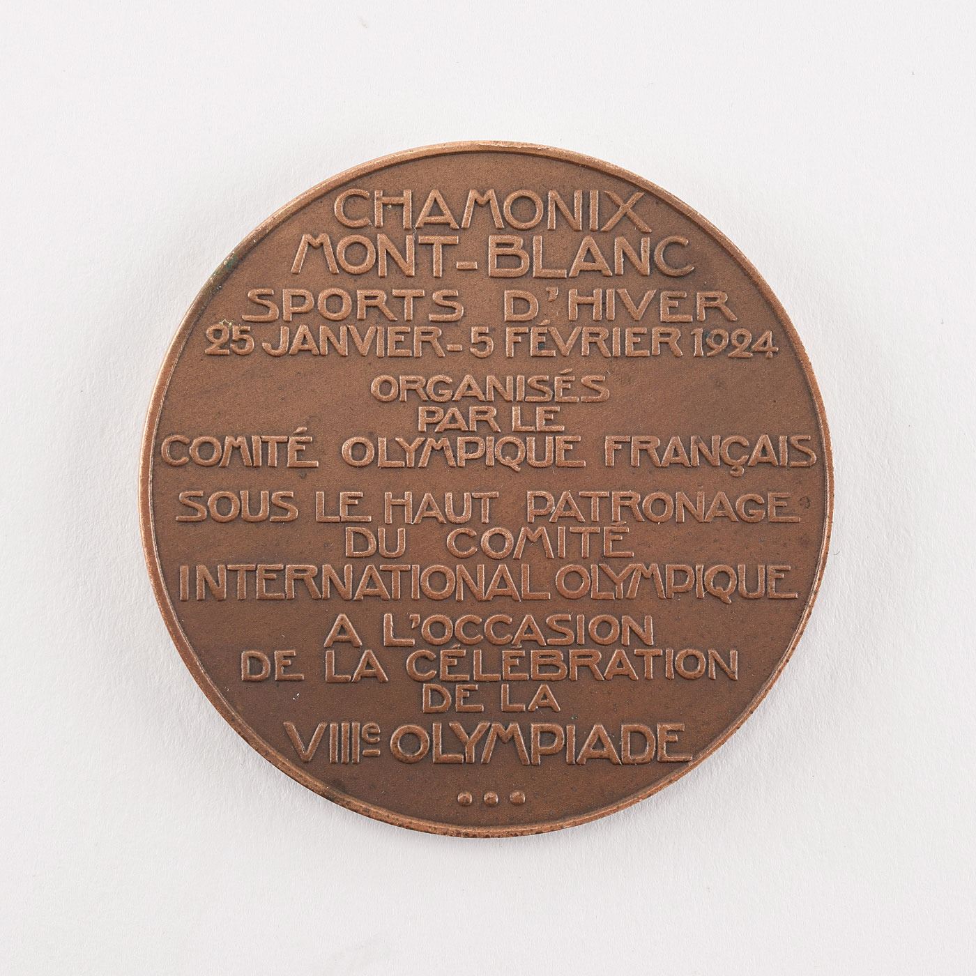 Highly coveted medal from the Chamonix 1924 Winter Olympics, which was issued as the bronze medal to third-place winners and also used as the participation medal of the Games. Bronze, 56 mm, 69 gm, by Raoul Benard, Paris. The front features a victorious athlete holding ice skates and skis high in the air with the Alps in the background; the reverse is inscribed at length in French, "Chamonix Mont-Blanc Sports D'Hiver, 25 Janvier-5 Fevrier 1924, Organises par le Comite Olympique Francais sous le haut patronage du Comite International Olympique a l'occasion de la celebration de la VIII Olympiade [Chamonix Mont-Blanc Winter Sports, 25 January-5 February 1924, Organized by the French Olympic Committee under the patronage of the International Olympic Committee on the occasion of the celebration of the VIII Olympiad]."