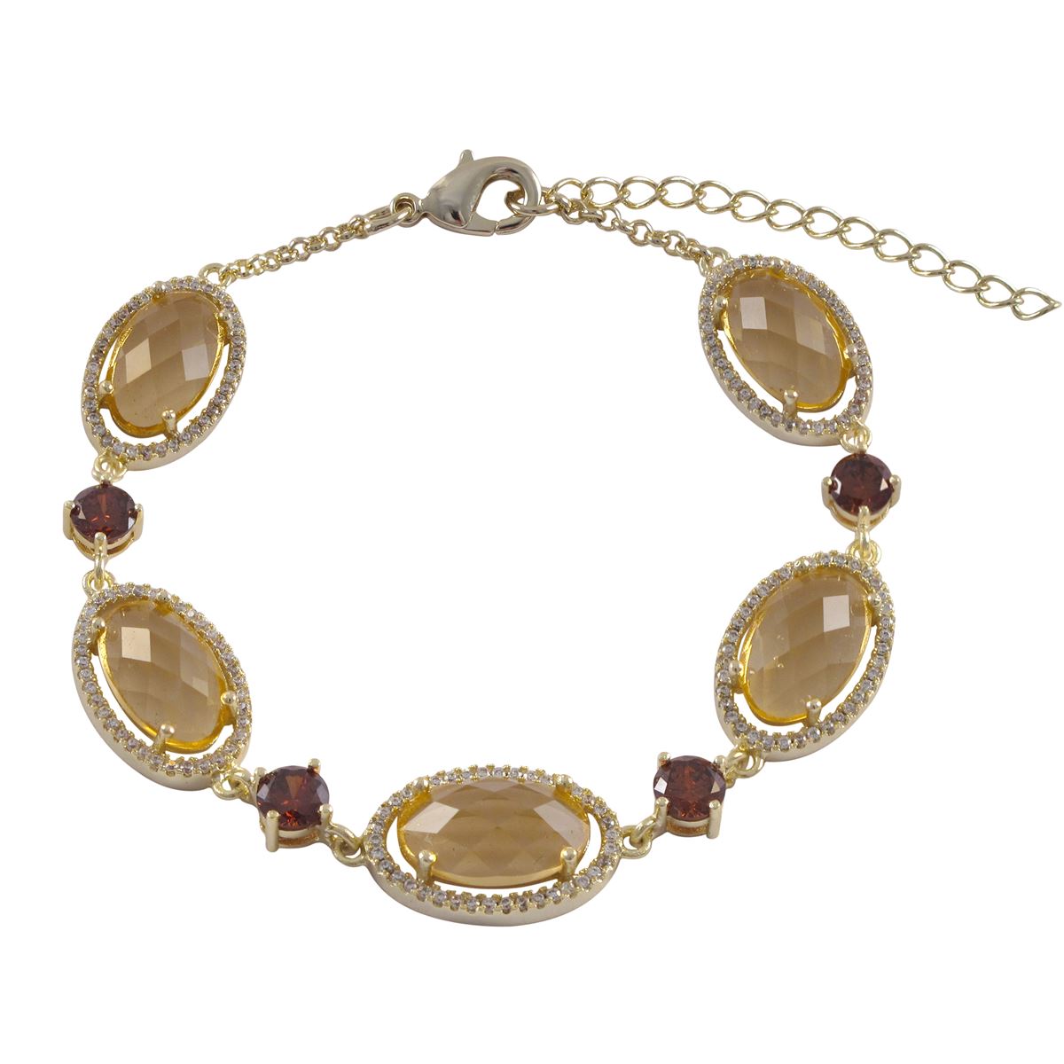 Champagne And Smoky Sliced Glass Oval Stones Set In Gold Plated Brass With CZ Border, Bracelet, 7.5 1