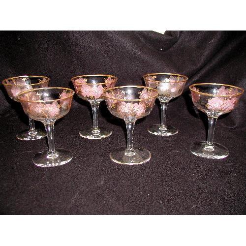 Set of 6 delicate and unique champagne glasses are from the 1920's. The depth of the pink floral design varies slightly in color intensity due to the hand painting of both the pink and gold folige. Gold rim and foot rim. The top of each is multi sided as opposed to round with slight ribs of crystal running down the bowl which gives a beveled look. Tiny nick on one base edge as well as anothr tiny nick on one top edge. Measure 3.5W X 4.75H.