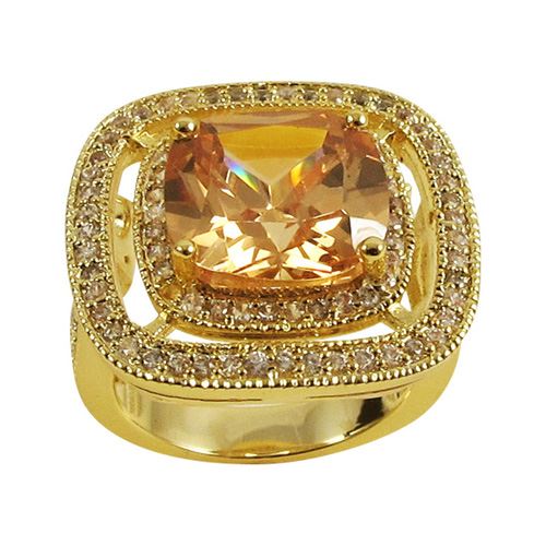 Champagne Square Crystal Surrounded With A Double Row Of White Czs, Gold Tone Brass Ring Size 7