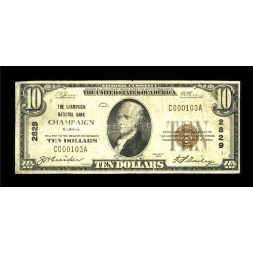 <B>Champaign, IL</B></I> - $10 1929 Ty. 1 <B>The Champaign NB</B></I> Ch. # 2829<BR> This <B>Very Good</B></I> example looks to have been wet at one time.<BR><I>From The Kansas City Collection.</B></I><BR><BR><b>Shipping:</b> Coins & Currency (<a target="_blank" href="http://www.heritageauctions.com/common/shipping.php">view shipping information</a>)