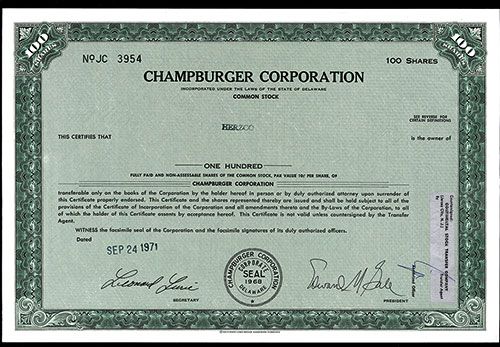 Delaware, 1971, 100 Shares, Issued Stock, Black on green border and underprint, Rare stock for fast food chain that Muhammad Ali had 6% equity in and received 1% of net sales firm went down for the count in 1972, VF condition, Security-Columbian BNC.