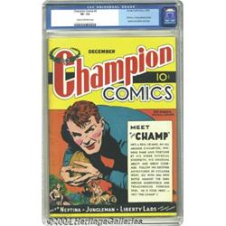 <B>Champion Comics #2 (Harvey, 1939) CGC VF- 7.5 Cream to off-white pages.</B></I> Although this book is #2, it is actually the first issue in the run. It features the Champ, Blazing Scarab, Jungleman, Neptina, and the Liberty Lads. This book rarely turns up for sale, and it features a neat football cover. Overstreet 2004 VF 8.0 value = $1,088. <BR><BR><B>Important notice:</B> Heritage usually auctions material at the rate of 200-250 lots per hour. On some occasions eBay Live bid software or the Internet may not be able to keep up with the pace of the auction. We recommend placing a realistic absentee bid now as insurance to avoid disappointment. Occasionally the auctioneer may eliminate or reject an eBay Live bid, and the auctioneer may also reopen a lot after the close of the eBay live bidding (usually because we missed an audience bid), and may reject your bid even if it shows you as the winning bidder. By bidding via eBay Live, you agree that Heritage may award the lot to another bidder at its sole discretion under the circumstances described above or any other reasonable circumstances. Since eBay bids are not shown to us until we open the lot on the floor, we treat those bids just like floor bids. In most cases the floor responds before the eBay bid is presented to us, due to Internet lag time, so for consistency we have made it a policy that floor bids are always considered first over tie eBay live bids. Also please note that all Heritage lots purchased through eBay Live carry a 20% Buyer's Premium. Please make sure you read the Terms and Conditions before you bid. </span></font></tr></table></td></tr></table>