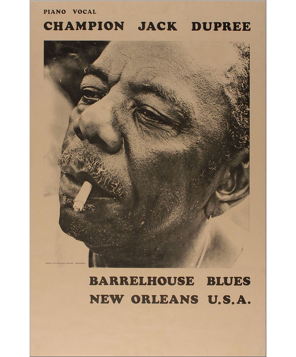 Well-regarded American blues pianist (circa 1910–1992). Promotional poster, 17.5 x 26, for Dupree’s appearance at Barrelhouse Blues in New Orleans signed in the bottom border in black ink and dated 1970. In very good condition, with a single tack hole to each corner, scattered edge creases, and signature very light and only slightly legible. Accompanied by a certificate of authenticity from Tracks.