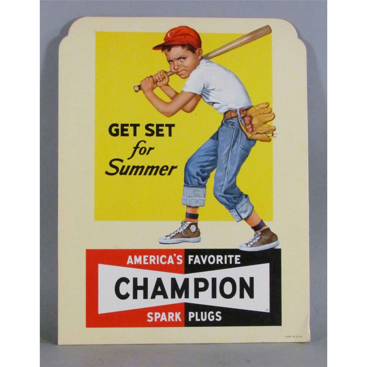 Champion Spark Plugs Die Cut Cardboard Easel Back Sign. Entitled, "Get Set for Summer". Excellent condition. 10 X 13 inches. Start Price $20