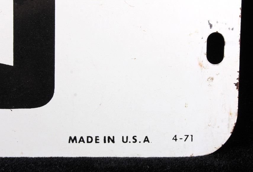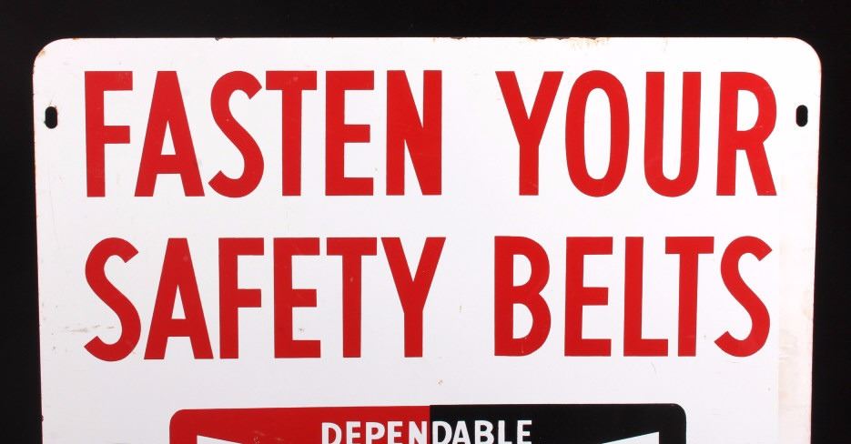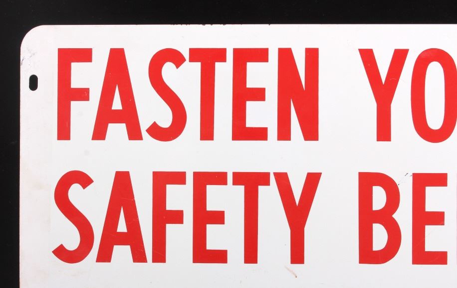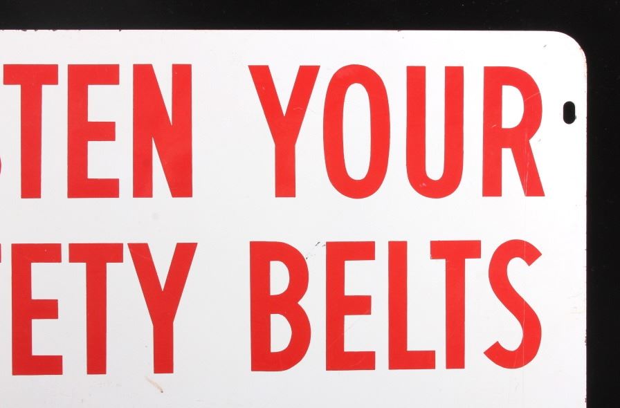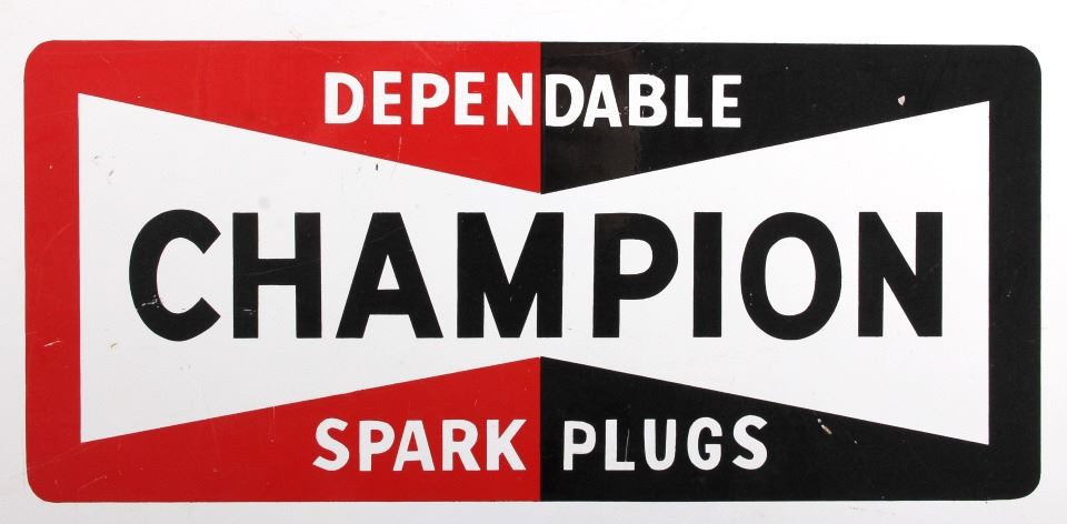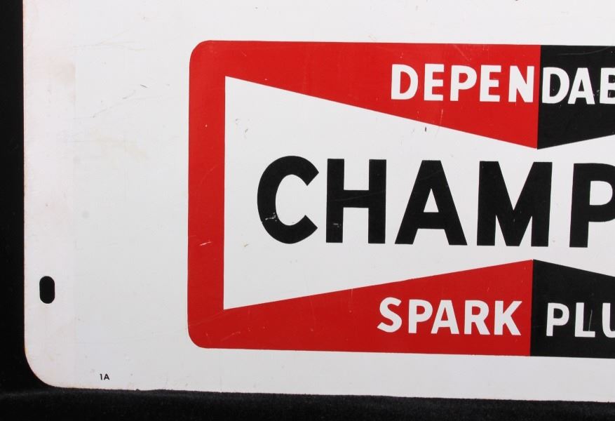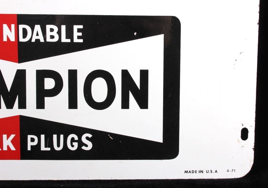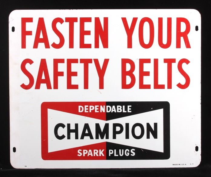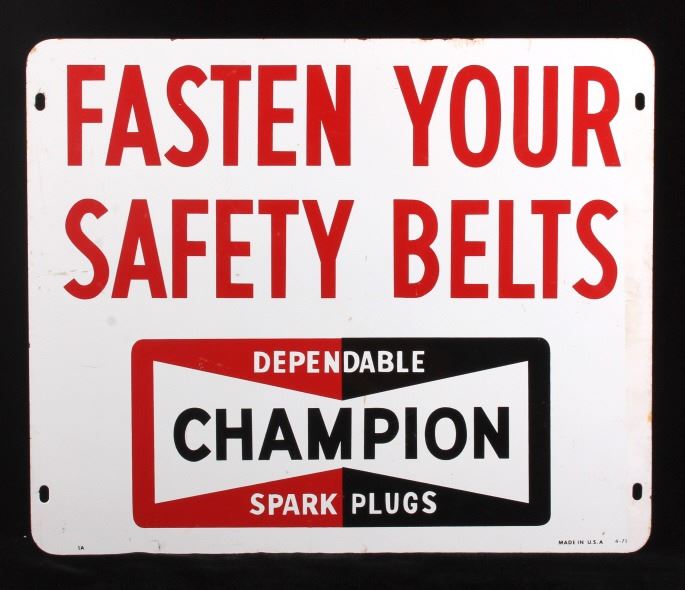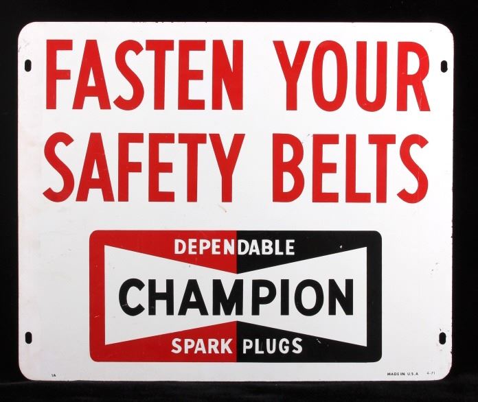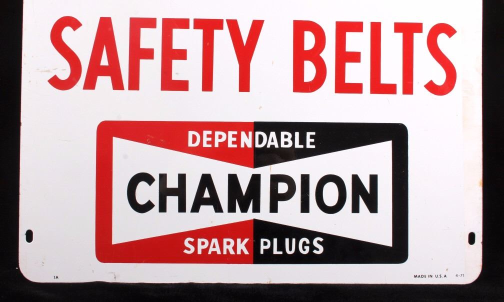 This is a Champion Spark Plugs double sided advertising sign. The sign shows the Champion bowtie logo in red and black and reads "Fasten Your Safety Belts". The sign is marked "Made in U.S.A. 4-71" in the lower right corner. The Champion sign is in good condition. It measures 14.5" x 17.5".