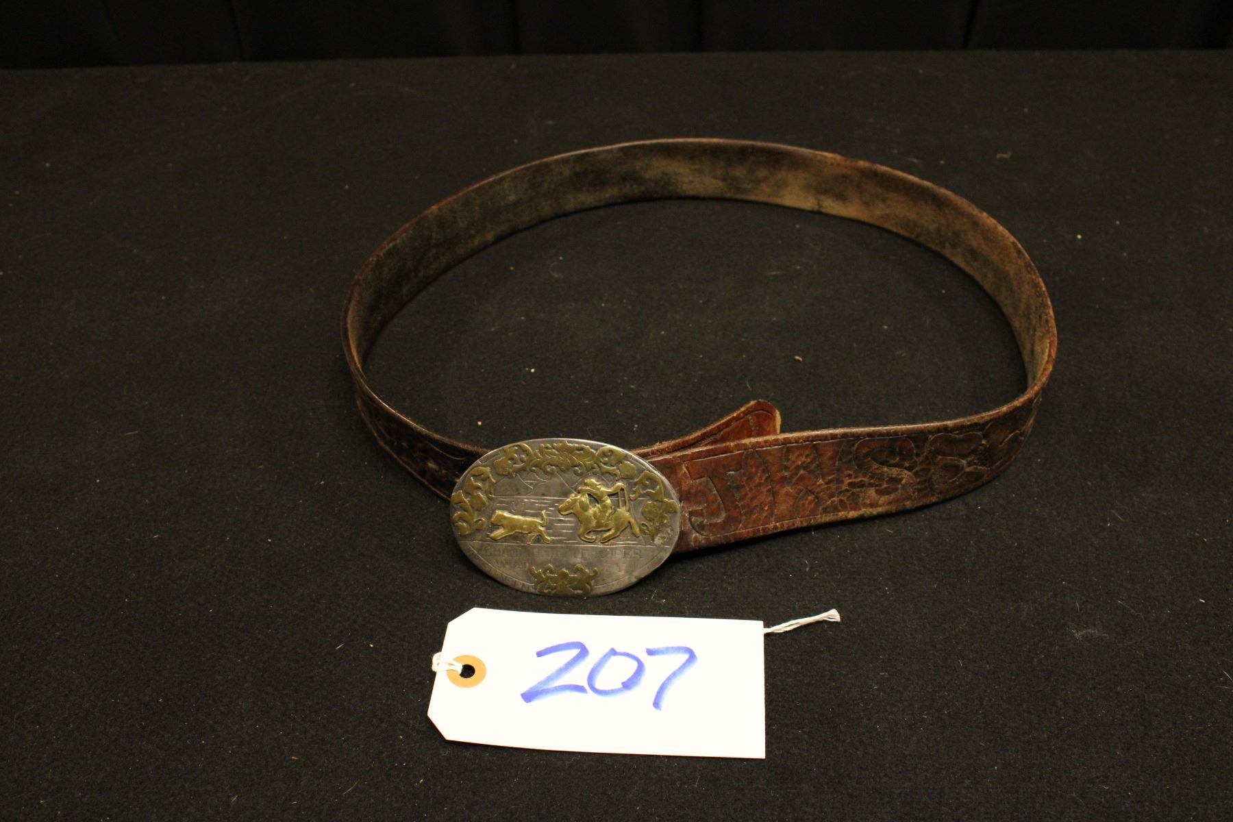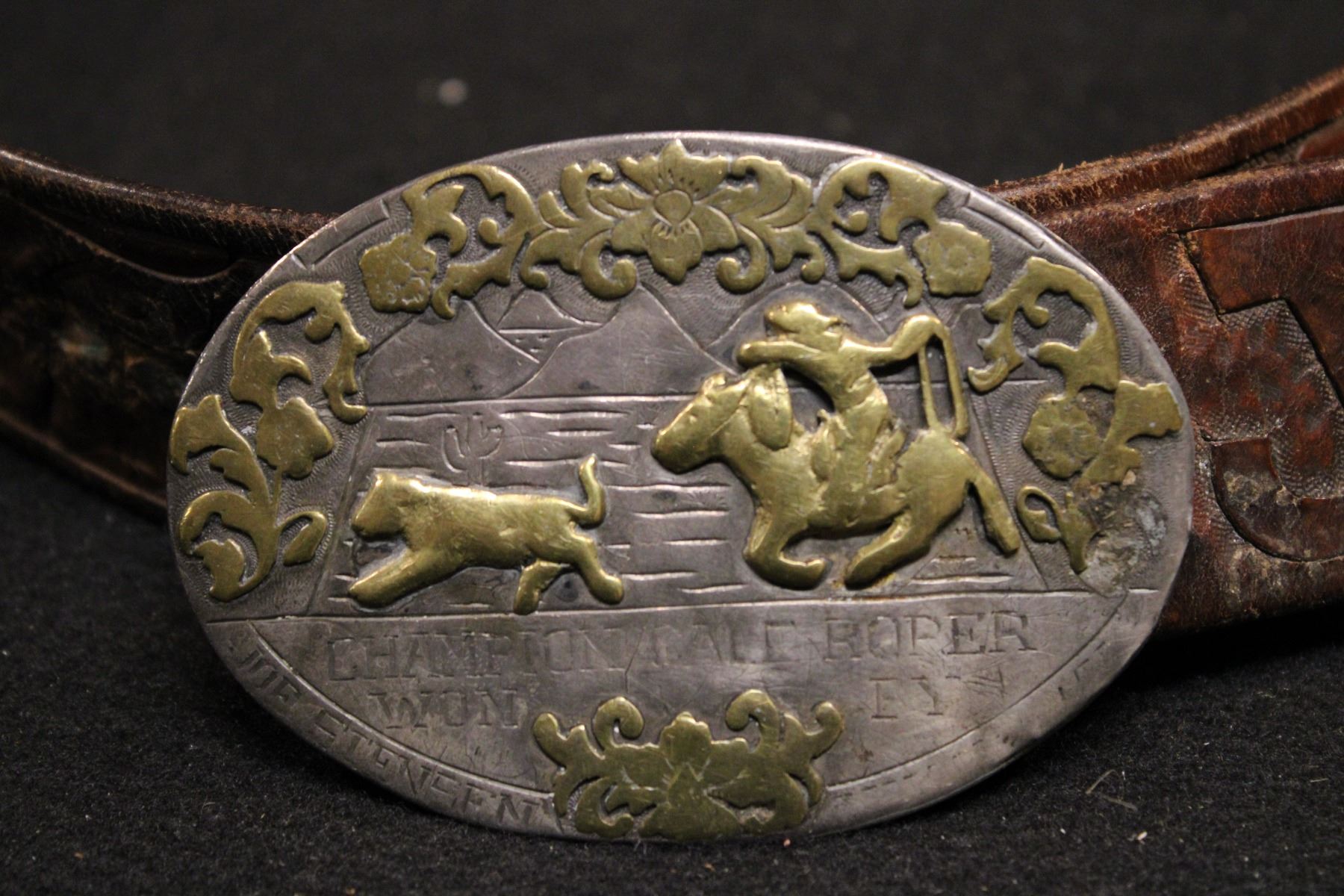 Early NW cowboy Joe Stenson Championship Calf Roping silver buckle w/ belt. Age appropriate wear. 3.75" w x 2.5" w