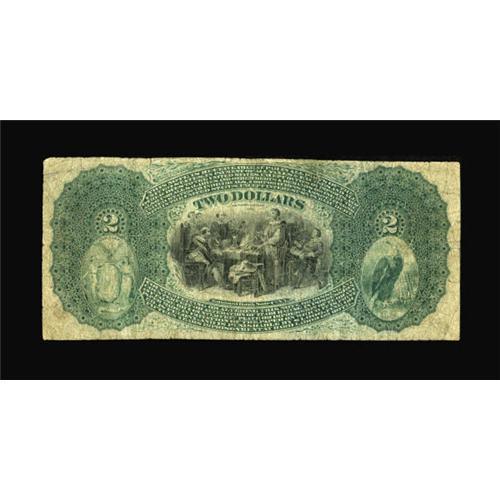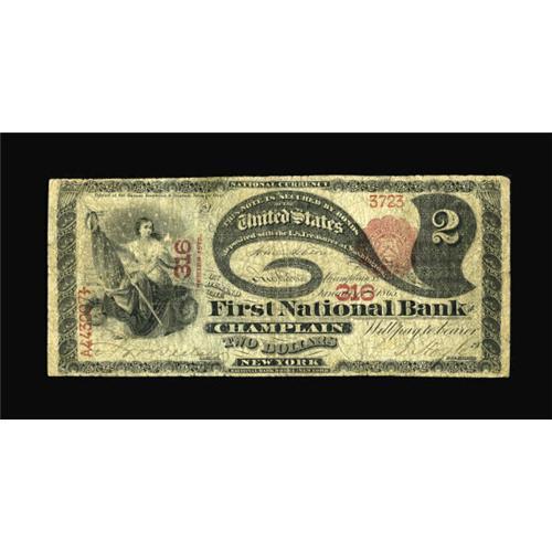 <B>Champlain, NY</B></I> - $2 1875 Fr. 390 <B>The First NB</B></I> Ch. # 316<BR> A well circulated but totally intact Lazy Deuce with plenty of wear but no real problems other than honest circulation. <B>Very Good,</B></I> with bright colors and good margins for the grade. <BR><BR><b>Shipping:</b> Coins & Currency (<a target="_blank" href="http://www.heritageauctions.com/common/shipping.php">view shipping information</a>)