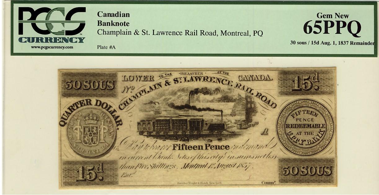 Champlain & St, Lawrence Rail Road Montreal PQ 1837 30 sous/15d PCGS UNC65PPQ