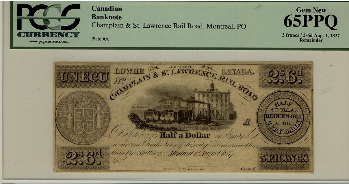 Champlain & St, Lawrence Rail Road Montreal PQ 1837 3Frs/2s6d PCGS UNC65PPQ
