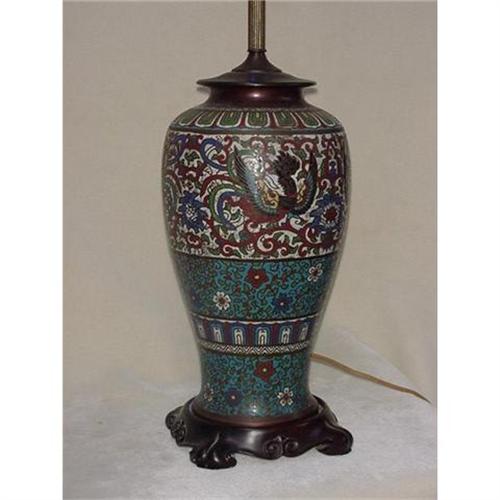 A very large Champleve vase decorated with floral designs and pheonix birds, 15" tall, 8" diameter, mounted as a lamp with beautiful old wood base and brass fittings. Overall height is 21" to bottom of socket. Condition is very good altough there are several minor chips to enamel but no dents. Should be rewired.