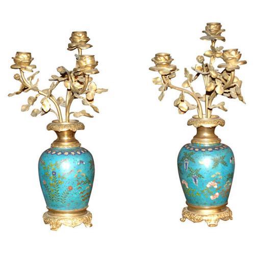 Formerly Napoleon III champleve vases made in China for European market. Sometime in the early 20th century a brass pedestal and ornate rose shaped candelabra were applied to each vase resulting in this beautiful pair.