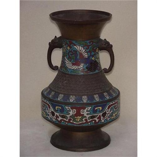 An early 20th century Japanese champleve vase,11 1/2" tall, 7" diameter. Brass body with colorful enamel decoration, marked made in Japan on underside. Condition is very good, could uas a cleaning, but there is no damage to the enamel work.