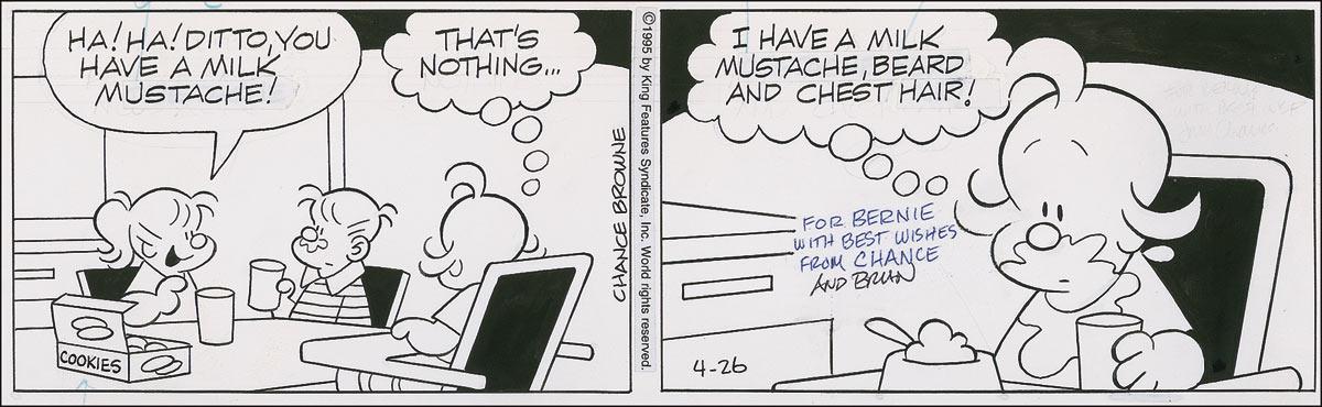 Original hand-inked two-panel Hi and Lois daily comic strip, dated April 26, 1995, on an off-white 13 x 4 sheet or artist’s cardstock, signed and inscribed in blue ballpoint in the second panel, “For Bernie, with best wishes from Chance,” and “and Chris.” Accompanied by a May 18, 1995, letter signed by Chance and Chris Browne acknowledging the photo. In fine condition. RRAuction COA.