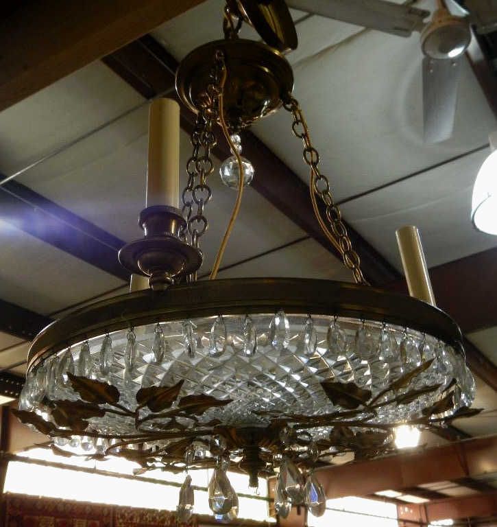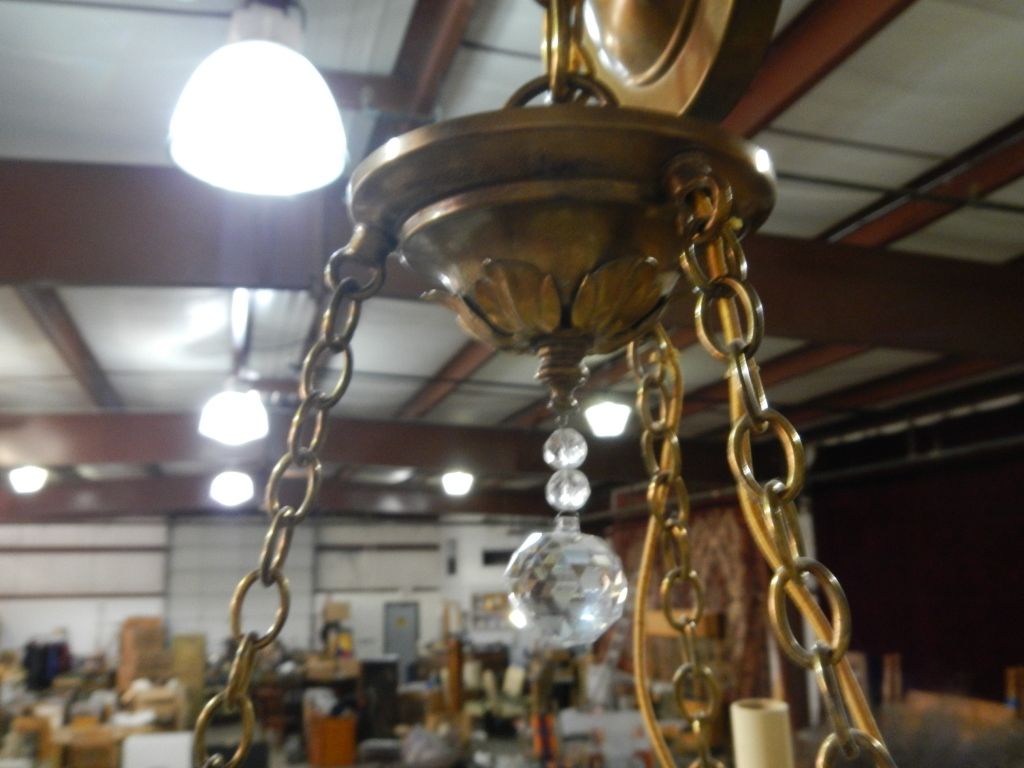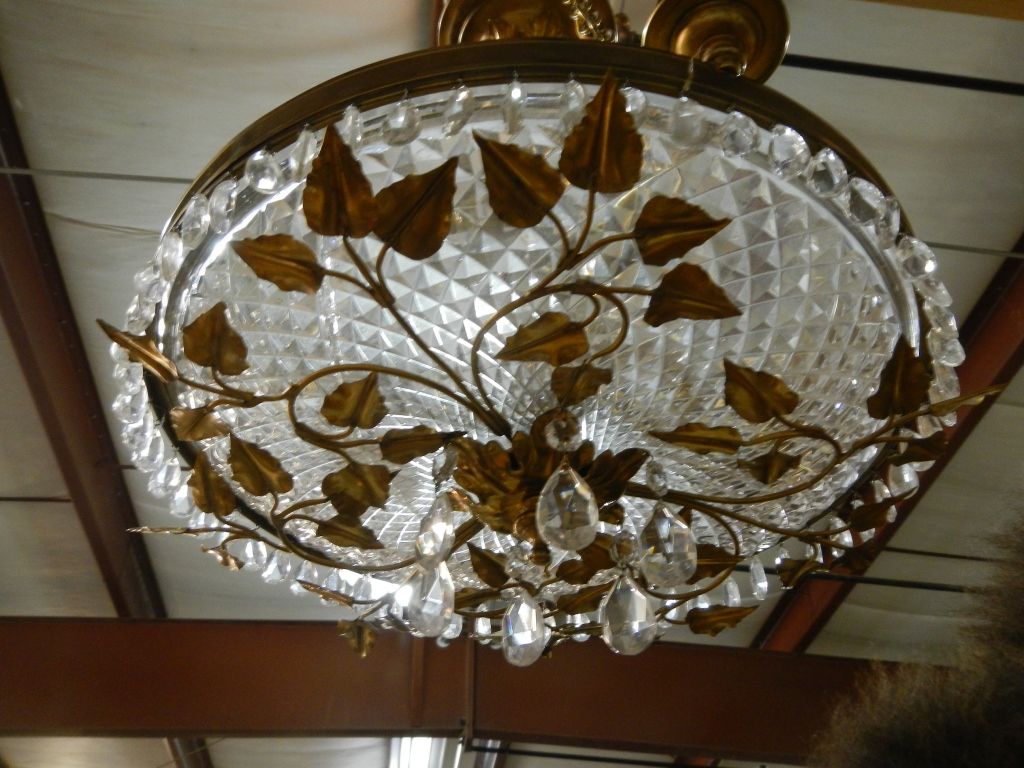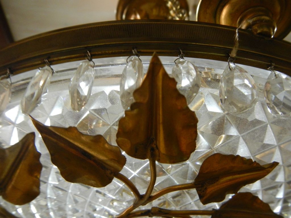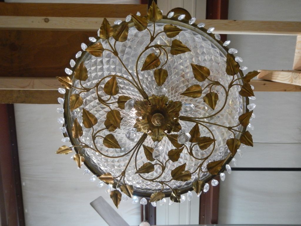 Chandelier from Fortin Mansion Billings, Mt - This piece came out one of the old Fortin Mansion in Butte from the 1950s when Billings. This features a crystal etched base covered in gold colored leaves and has many crystal pieces hanging. Measures 15.5-16" across. and 18" tall. The three lights are 5.25" long.