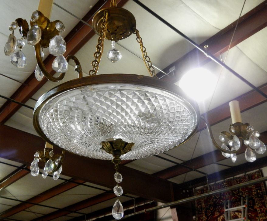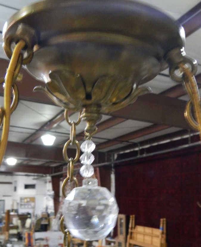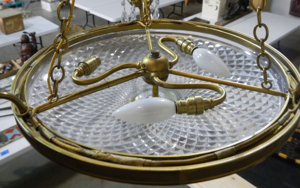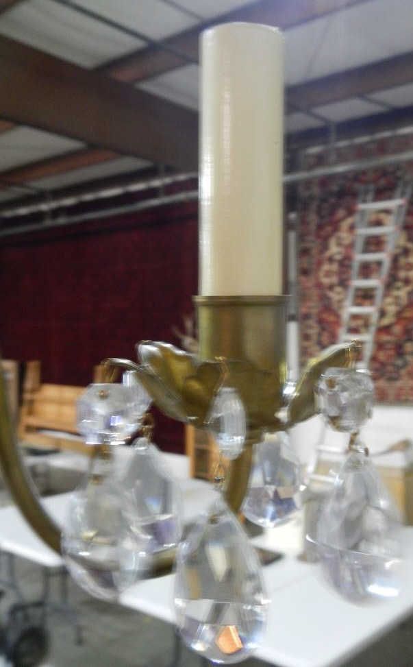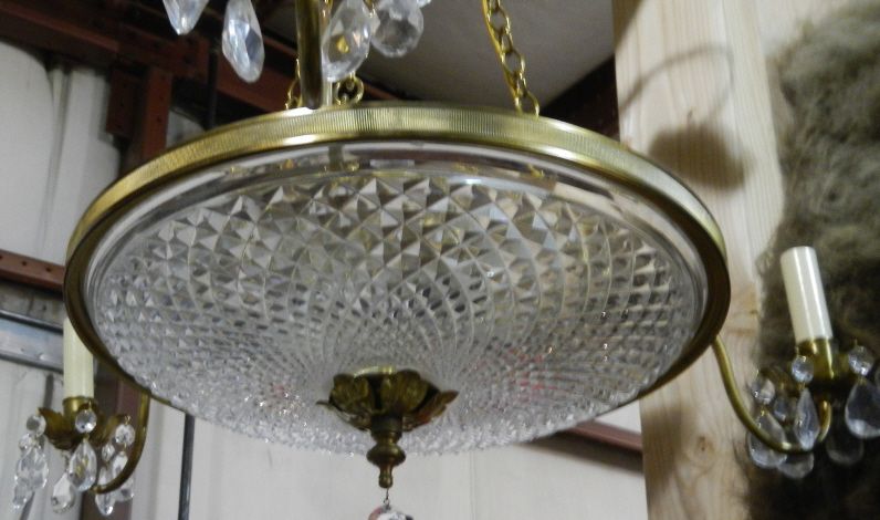 Chandelier from the Fortin Mansion Billings, Mt - This piece is from the 1950's Fortin Mansion in Billings Montana. This piece features a crystal bottom with three lights inside to light up the top and three candle stick lights extending, all are covered in crystals. Measures 21" from candle stick to candle stick, the diameter of center is 15.5" and from the ceiling to the bottom of the light is 18".