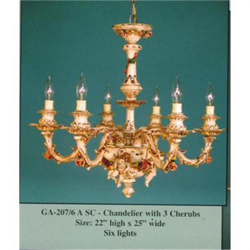 Capodimonte Chandelier with 6 Lights and 3 Cherubs Size: 22" high x 25" wide Satisfaction Guaranteed All our capodimonte pieces are 100% authentic, made with the best craftmanship in Italy. Capodimonte is more than a century Italian style of the finest porcelain once reserved for kings and queens. The style became popular when the royal family in Italy fell in love with the beauty of Capodimonte arts. The selection you see is made by artisans, according to the same tradition dating back to the 18th Century.<BR>Free Shipping in the continental US