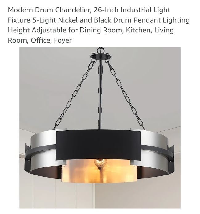 26-in industrial light fixture, nickel pendant lighting, height adjustable, for dining room, kitchen, living room, or office.