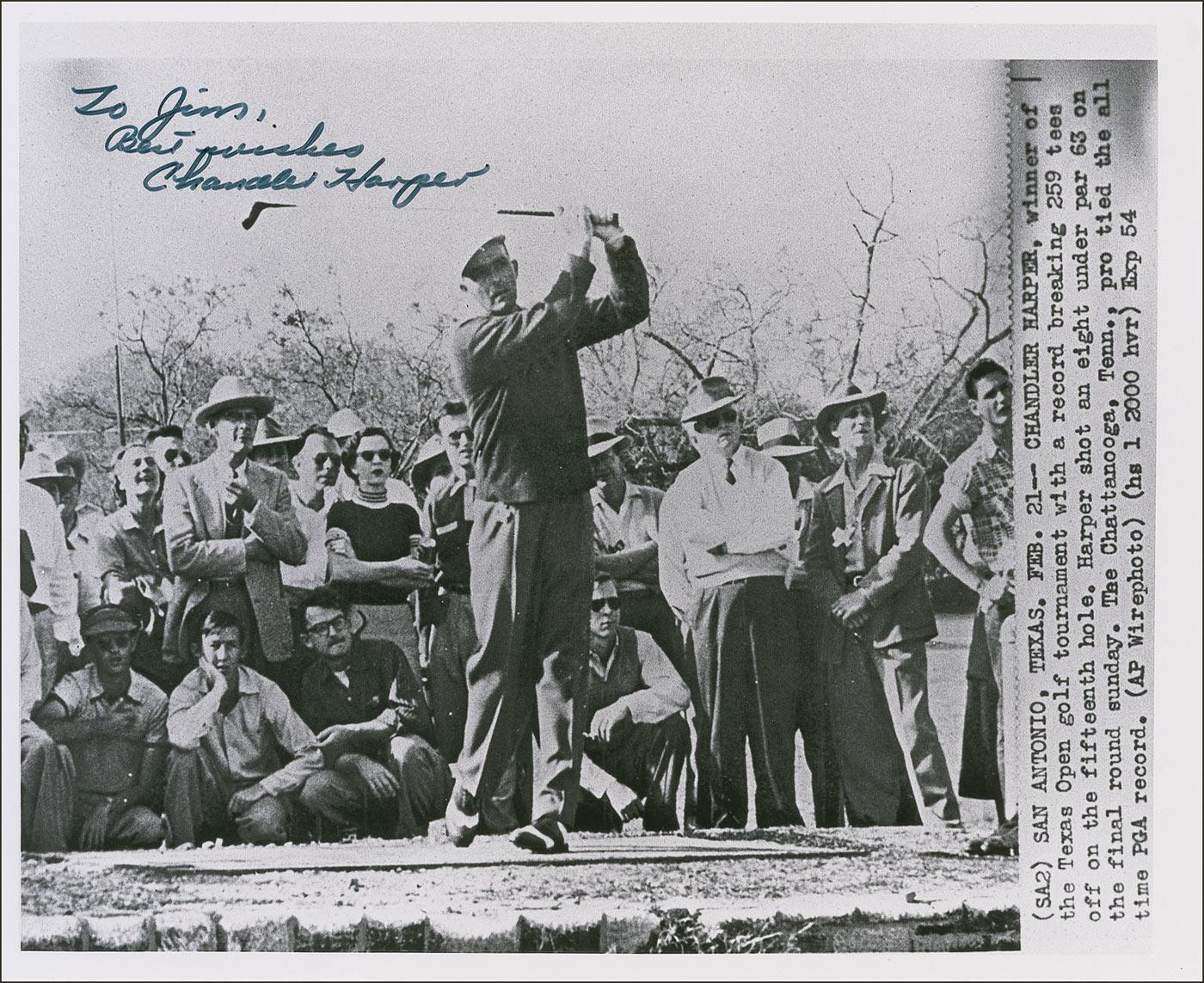 Professional golfer (1914–2004) best known for winning the 1950 PGA Championship. Glossy 10 x 8 photo of Harper at a Tennessee golf outing, reproduced from a wire photograph, signed and inscribed in black felt tip “To Jim, Best wishes, Chandler Harper.” In fine condition.