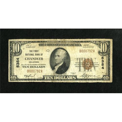 <B>Chandler, OK</B></I> - $10 1929 Ty. 1 <B>The First NB</B></I> Ch. # 5354<BR> Not many distractions on this bright <B>Very Good</B></I> note.<BR><I>From The Rolling Plains Collection</B></I><BR><BR><b>Shipping:</b> Coins & Currency (<a target="_blank" href="http://www.heritageauctions.com/common/shipping.php">view shipping information</a>)