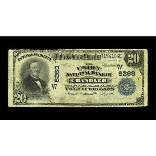 <B>Chandler, OK</B></I> - $20 1902 Plain Back Fr. 652 <B>The Union NB</B></I> Ch. # (W)6269<BR>While small notes from here are easily obtained, large examples represent a considerable challenge to find, with the census standing at one Territorial and six state issues. This piece is new to that listing, although typical in grade to most others in the count. <B>Very Good-Fine,</B></I> with more than a few pinholes at either end.<BR><BR><b>Shipping:</b> Coin/Currency (<a target="_blank" href="http://www.heritageauctions.com/common/shipping.php">view shipping information</a>)