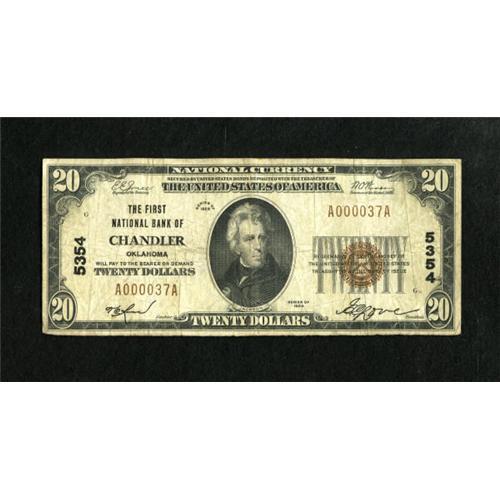 <B>Chandler, OK</B></I> - $20 1929 Ty. 1 <B>The First NB</B></I> Ch. # 5354<BR> Low serial number 37 is a pleasing attribute of this well inked note. <B>Very Good-Fine</B></I>.<BR><I>From The Rolling Plains Collection</B></I><BR><BR><b>Shipping:</b> Coins & Currency (<a target="_blank" href="http://www.heritageauctions.com/common/shipping.php">view shipping information</a>)