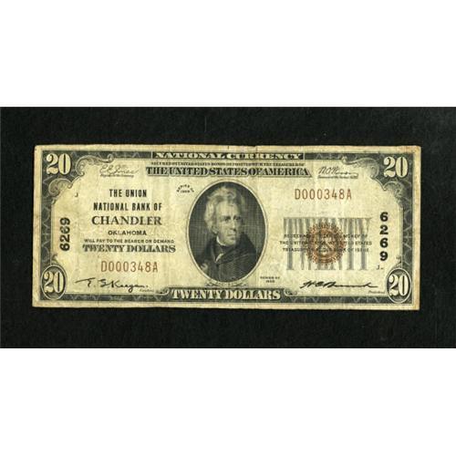 <B>Chandler, OK</B></I> - $20 1929 Ty. 1 <B>The Union NB</B></I> Ch. # 6269<BR> A nice <B>Fine</B></I> from this Lincoln County bank.<BR><I>From The Rolling Plains Collection</B></I><BR><BR><b>Shipping:</b> Coins & Currency (<a target="_blank" href="http://www.heritageauctions.com/common/shipping.php">view shipping information</a>)
